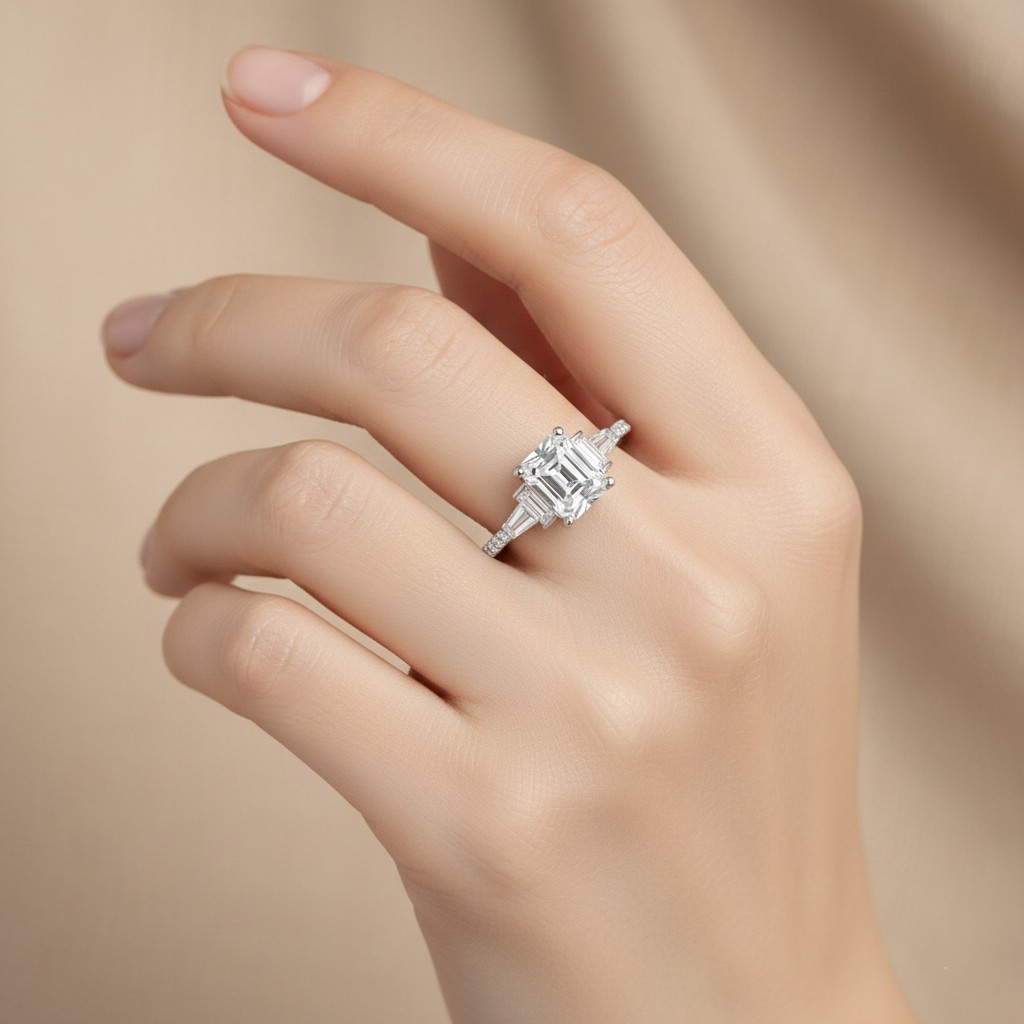 • This sleek design celebrates the sophistication of geometry with a striking emerald-cut diamond. Its elongated facets create flashes of mirror-like brilliance, accentuated by a slim pavé diamond band that balances minimalism with radiance. The prong setting elevates the stone, giving it prominence while ensuring light enters from all angles. Modern, polished, and endlessly versatile, this ring is an ode to clarity and refined taste.