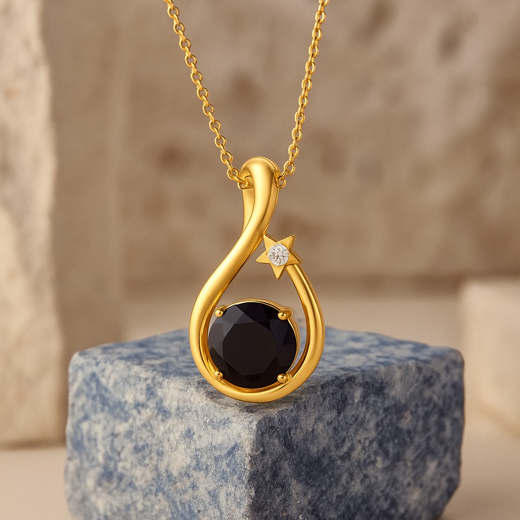 • A bold 21mm pendant where a striking customizable black gemstone rests within a sweeping gold curve, accented with a single VS1 diamond star. This design embodies mystery, strength, and the rare elegance of night’s quiet power.
