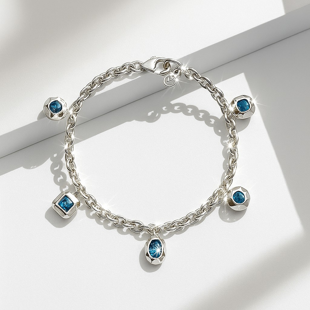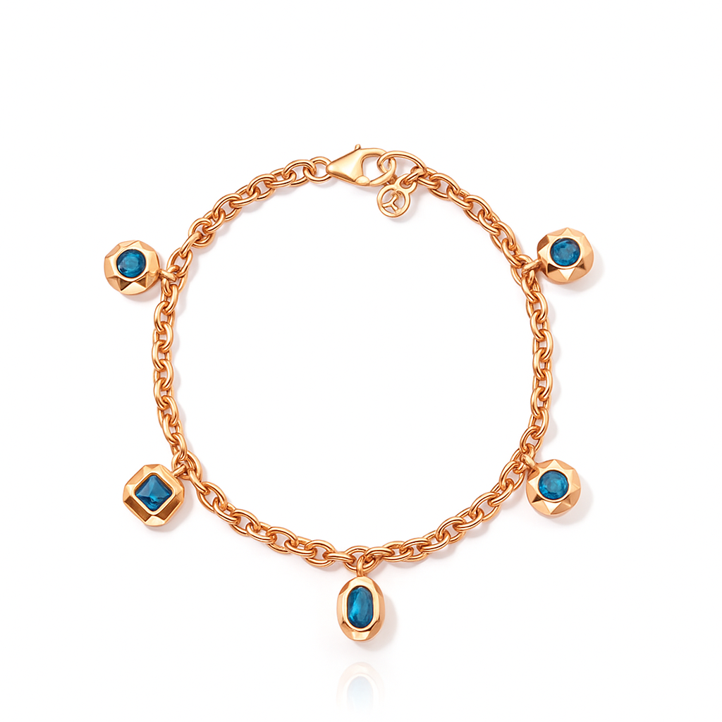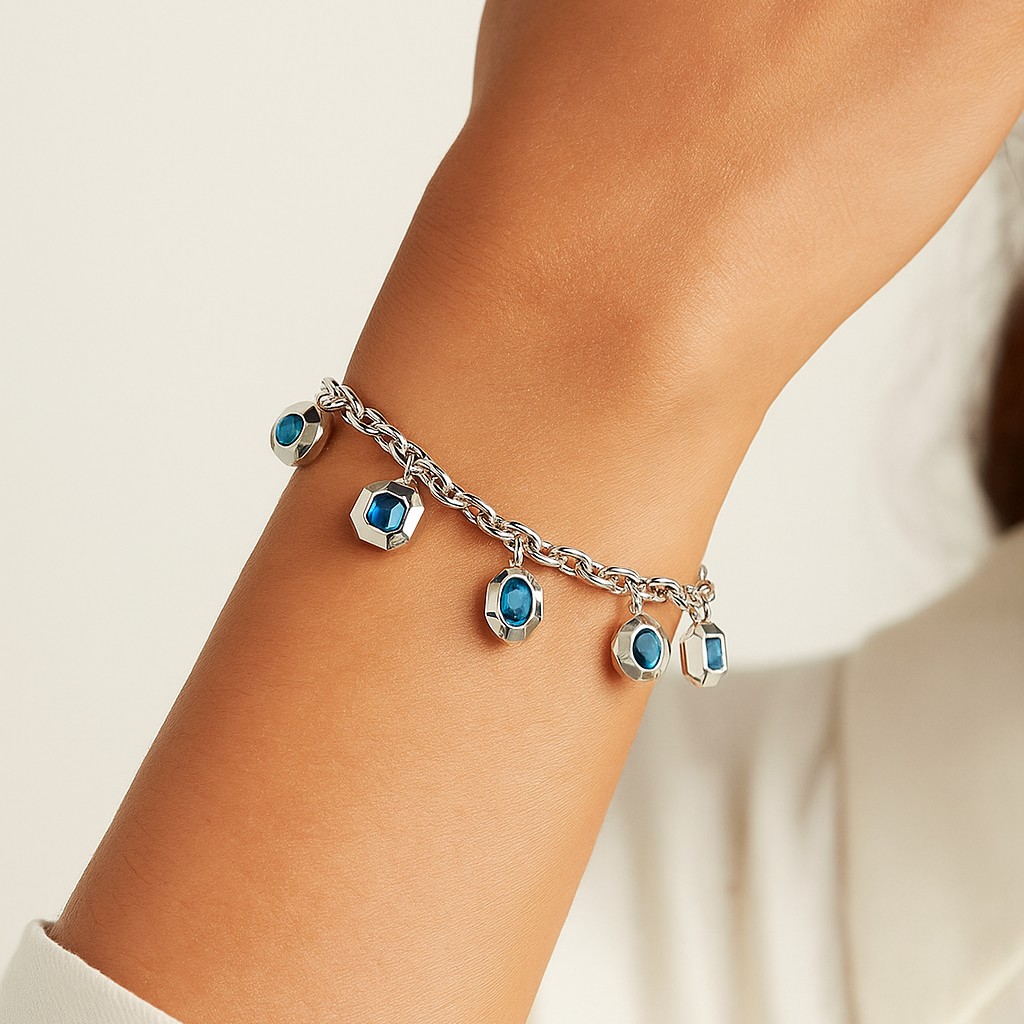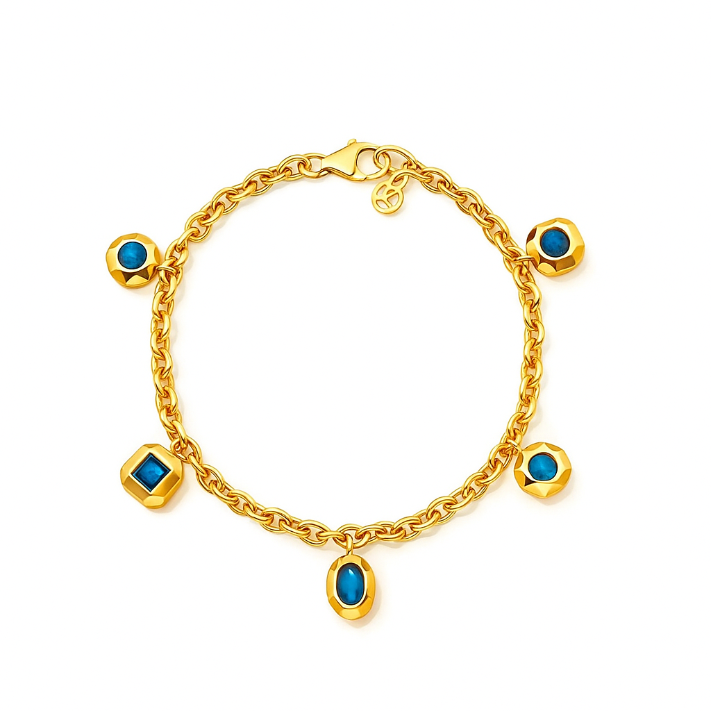 Five striking blue gemstone charms in mixed cuts (round, oval, square) sway along a sleek chain, adding a touch of movement and intrigue. A versatile statement that merges youthful allure with refined artistry.