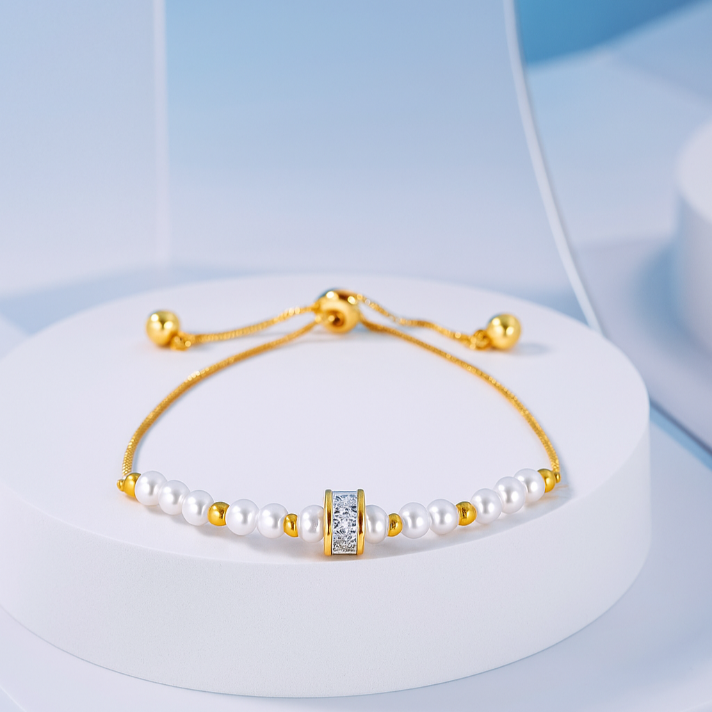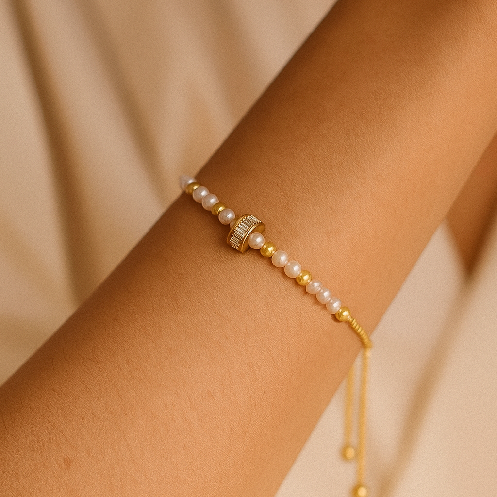 An elegant line of luminous freshwater pearls dances gracefully along a fine gold chain, accented with delicate VS1 diamonds. The sliding clasp ensures a perfect fit, creating a bracelet that is as versatile as it is radiant. A symbol of purity and harmony, this piece becomes an intimate expression of refined femininity.