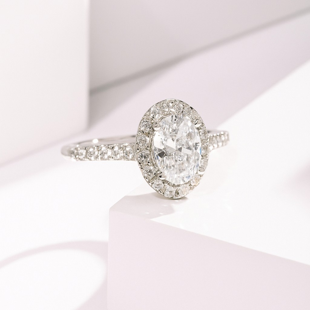 At the center of this refined creation rests an oval-cut diamond, its elongated facets exuding timeless sophistication. The central stone is embraced by a halo of brilliant pavé diamonds, designed to enhance its luminosity while maintaining a delicate elegance.