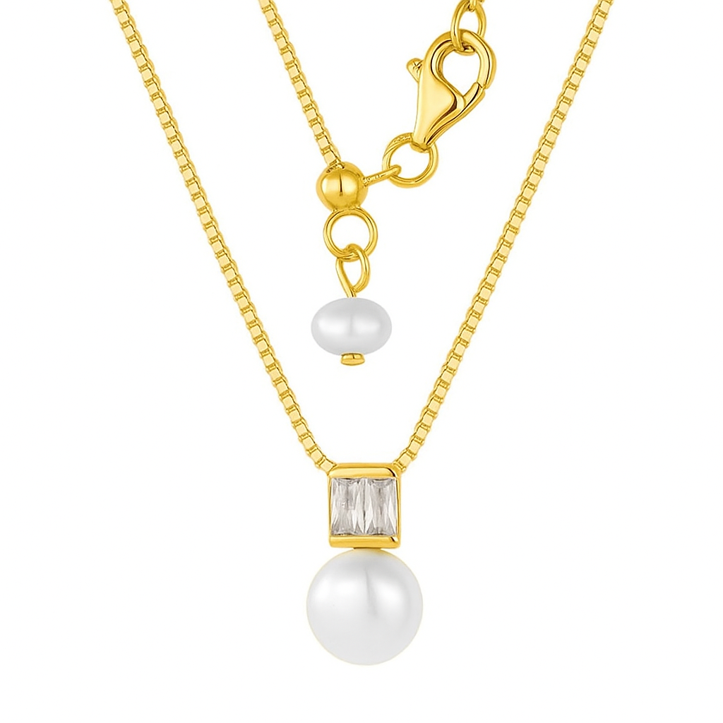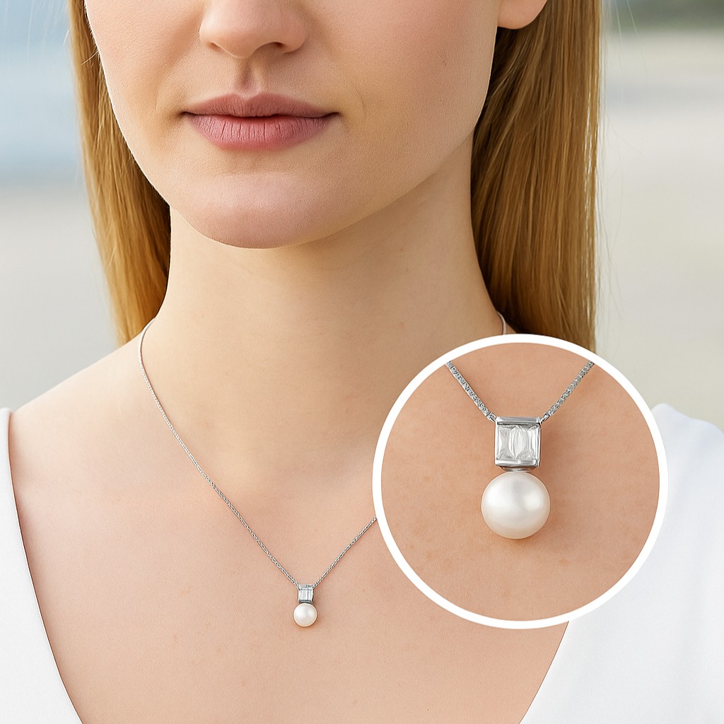 An elegant pearl pendant suspended beneath a radiant square-cut diamond on a delicate chain. A timeless union of purity and brilliance, it whispers of refined femininity and the quiet luxury of heritage elegance.