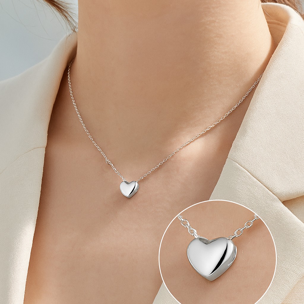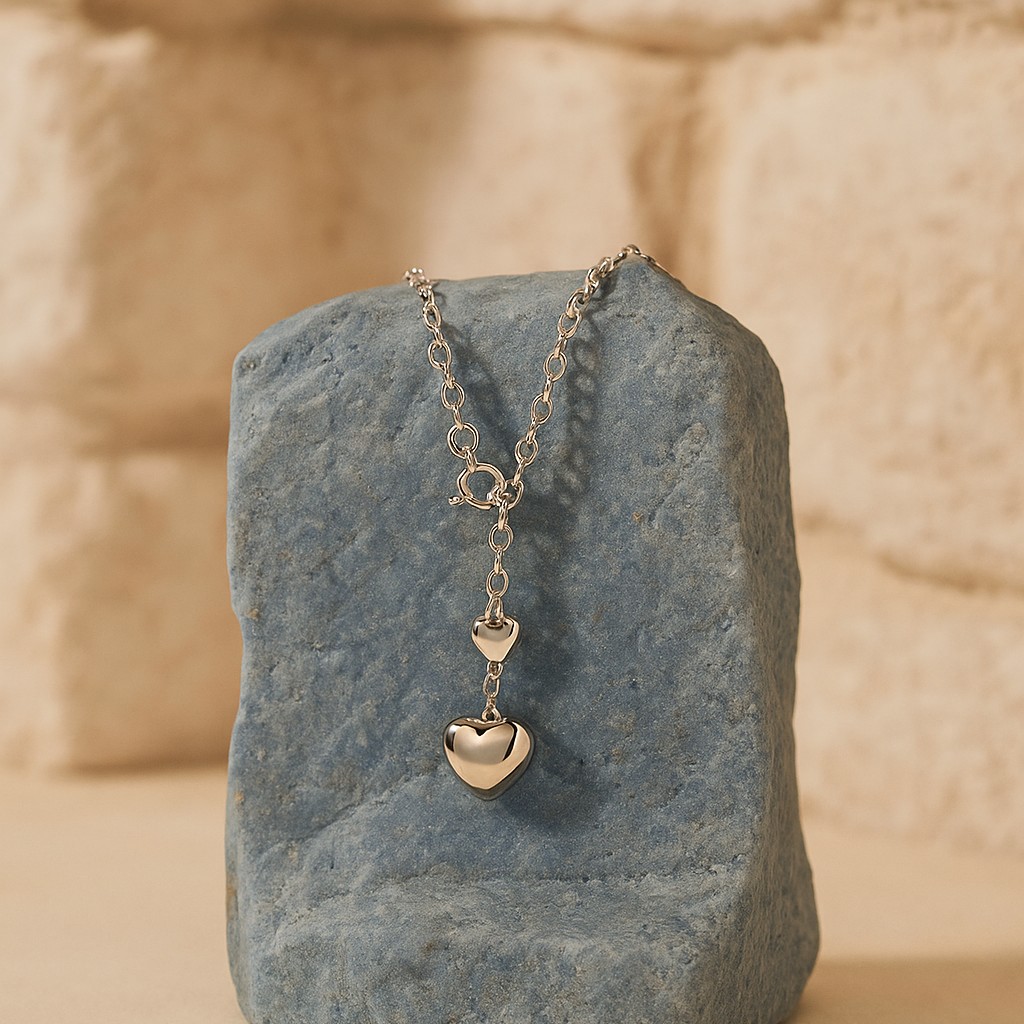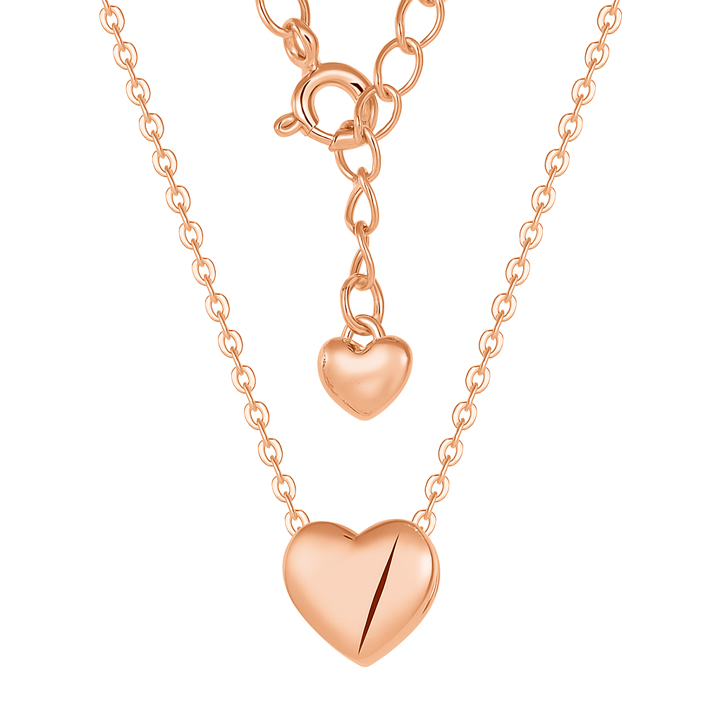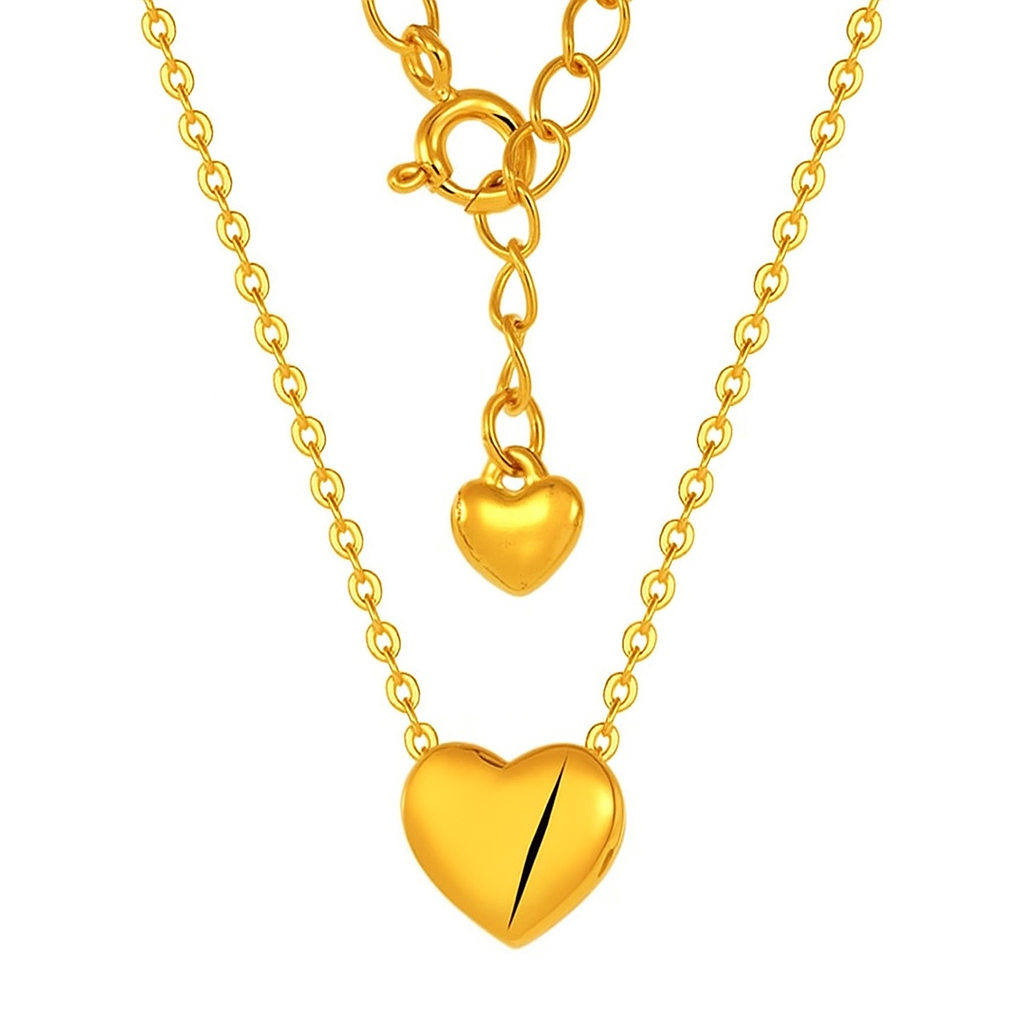 A polished, smooth heart pendant rests at the center of a sleek chain, paired with a dainty heart at the clasp. This modern yet sentimental design represents love’s pure simplicity and enduring connection. Also available in 916 and 999 gold