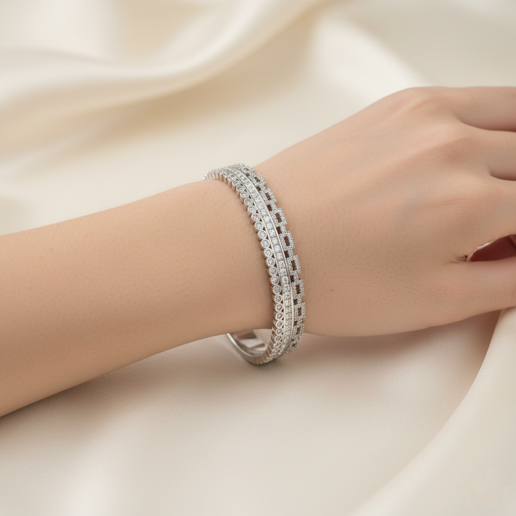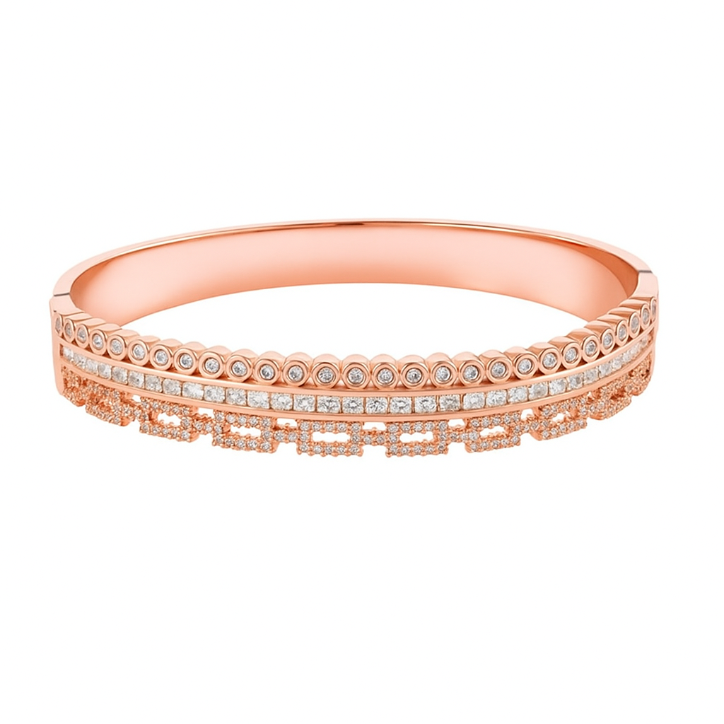 A bold fusion of geometric chain motifs and pavé-set VS1 diamonds, this bangle embodies strength and refinement. Its structured silhouette is softened by the brilliance of perfectly aligned stones, creating balance between power and elegance. It is an architectural masterpiece in miniature, designed for the modern sophisticate.