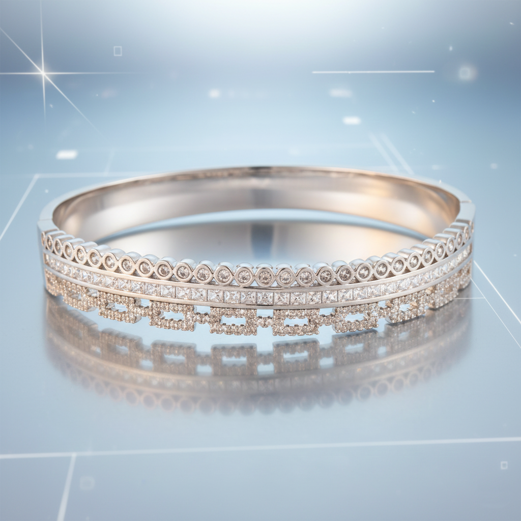 • A bold fusion of geometric chain motifs and pavé-set VS1 diamonds, this bangle embodies strength and refinement. Its structured silhouette is softened by the brilliance of perfectly aligned stones, creating balance between power and elegance. It is an architectural masterpiece in miniature, designed for the modern sophisticate.