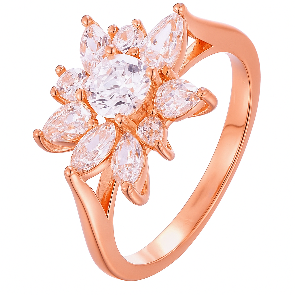 A golden blossom unfolds in this statement ring, where marquise and round-cut stones form a dazzling floral motif around a luminous central gem. Each petal radiates light, symbolizing vitality, grace, and the flourishing beauty of nature. Perfect for those who wish to wear the brilliance of a garden on their hand.
