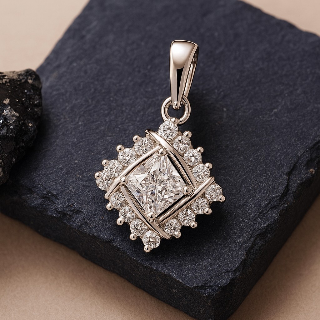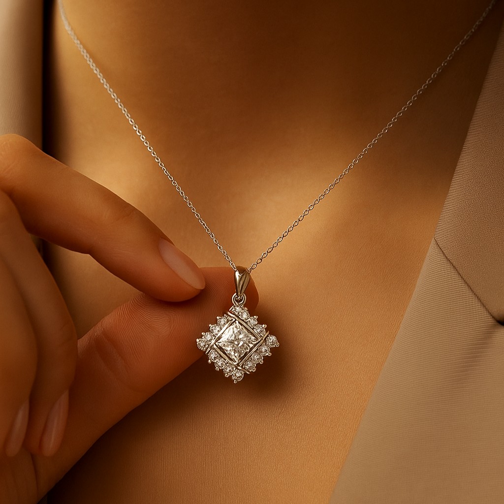 An exquisite square diamond sits at the heart of this pendant, haloed by a constellation of VS1 diamonds. Interwoven arcs cross gracefully over the centerpiece, creating a sense of infinite light and sophisticated allure.