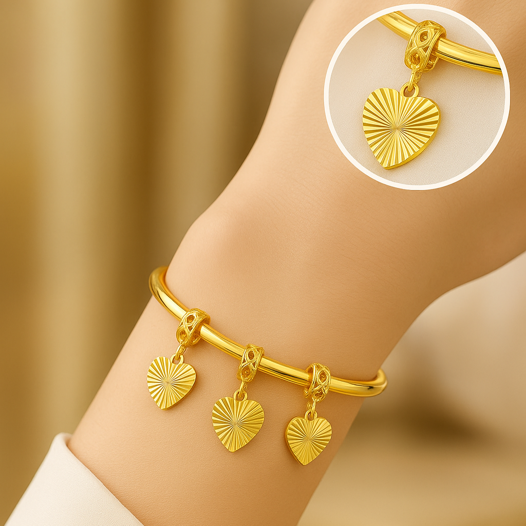 • The Radiant Heart Charm 916 Gold Bangle embodies elegance and heartfelt beauty. Each heart charm gleams with a stunning sunburst texture, reflecting light with every movement. Expertly crafted from high-quality 916 gold, it symbolizes warmth, affection, and everlasting love. Perfect for everyday elegance or as a precious gift that speaks straight to the heart.