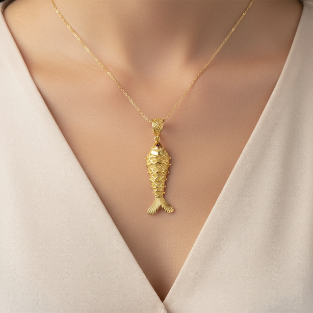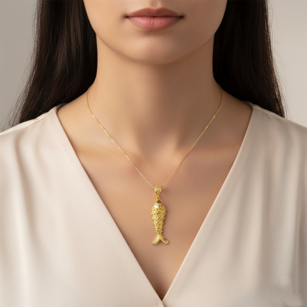 An exquisite gold koi pendant symbolizing strength, prosperity, and graceful beauty.