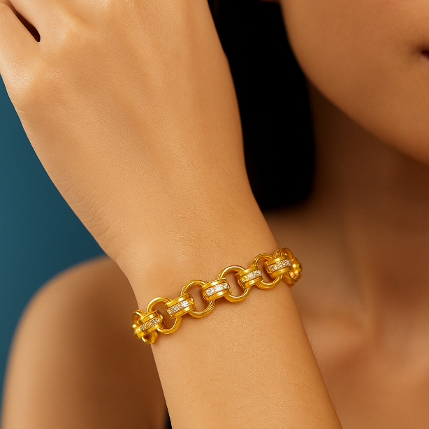 • The Regal Chain Luxe Bracelet redefines classic luxury with its interlocking circular links, masterfully accented by sleek white-gold details. Each link reflects power and precision, creating a commanding yet elegant statement on the wrist. Crafted for those who appreciate contemporary design with a touch of grandeur, this bracelet exudes confidence and timeless allure. A perfect piece for elevating both formal and everyday looks with effortless sophistication.