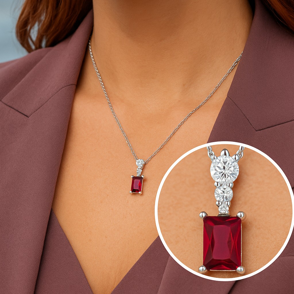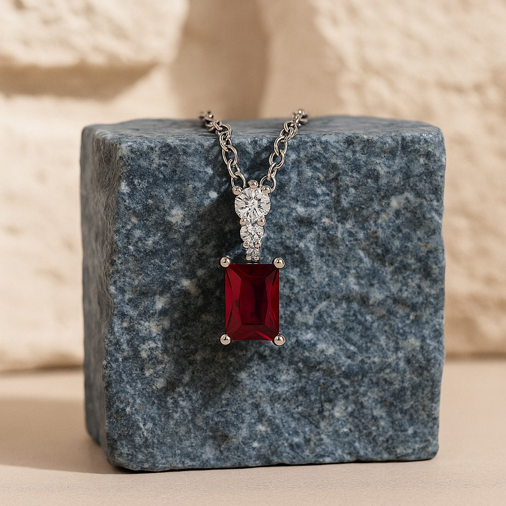• An emerald-cut gemstone takes center stage — available in ruby, sapphire, emerald, or diamond — enhanced by a trio of brilliant VS1 diamonds. The sleek geometry balances vibrant color with timeless sparkle, making it an heirloom-worthy jewel.