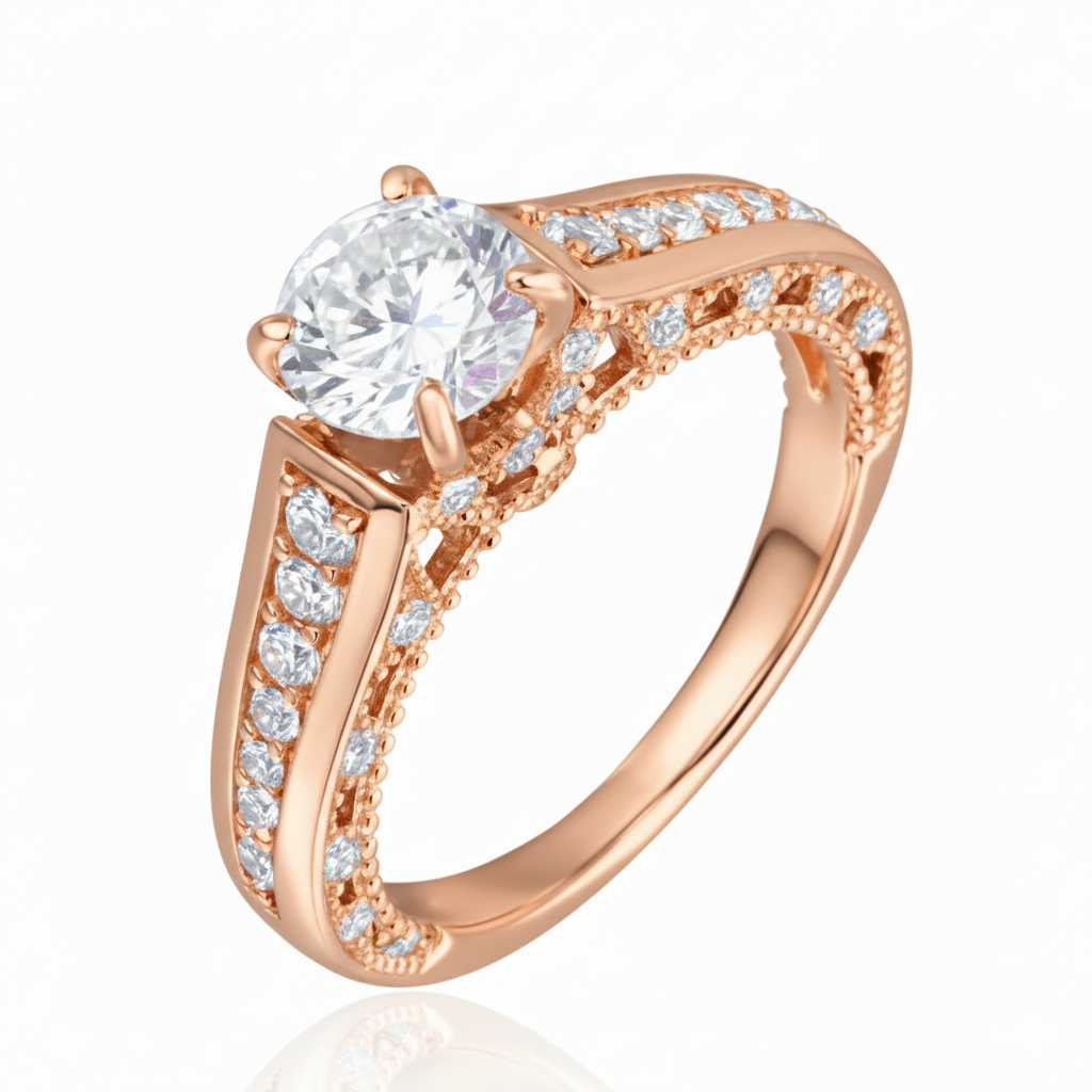 Channel-set diamonds line a stately band, leading the eye to a magnificent round solitaire elevated in majesty. Intricate metalwork enhances its grandeur, a nod to vintage opulence. For the one who reigns over your heart, this is a ring that commands admiration with refined grace.