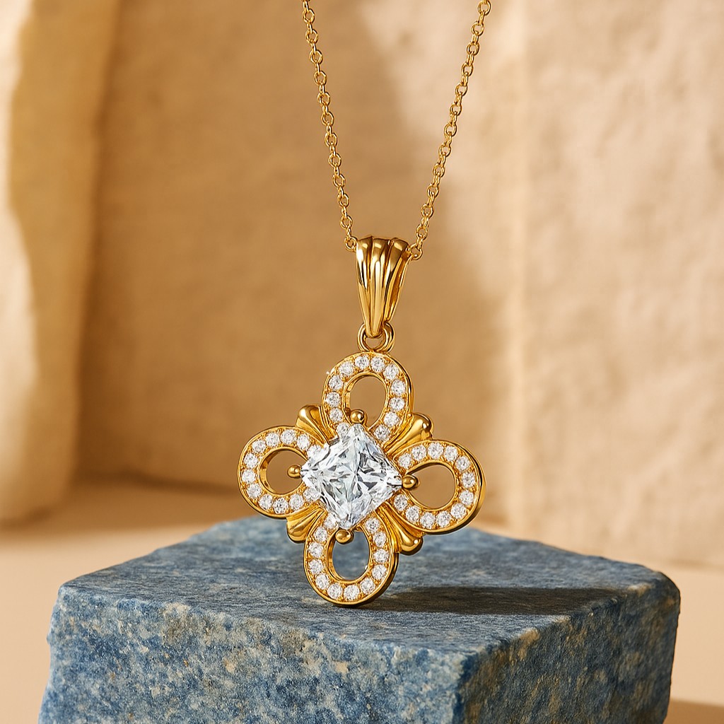• A masterpiece of balance and symmetry, this pendant intertwines looping diamond-lined arcs around a customizable central stone. Measuring 23mm in height, it becomes a modern emblem of sophistication — a talisman of destiny, luxury, and divine design.