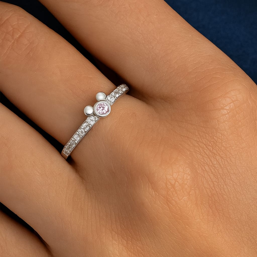 With a blush-pink stone at its heart and dazzling pavé accents along the band, this ring balances chic style with a touch of mischief. A statement of fun-loving sophistication, perfect for stacking or wearing solo.