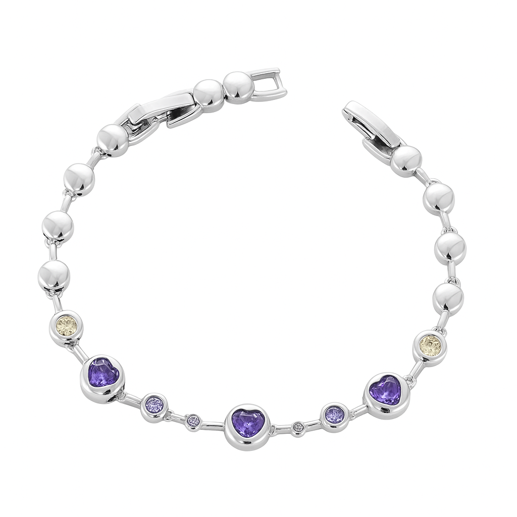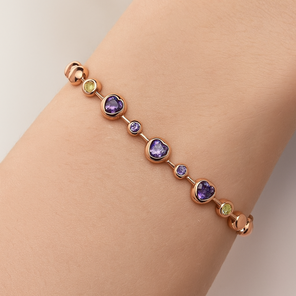 Crafted in 18k rose gold, this bracelet radiates romance through its delicate line of polished golden beads, interspersed with luminous purple heart-shaped amethysts and VS1 diamonds. A symbol of love and individuality, it drapes gracefully around the wrist, whispering elegance with every movement.