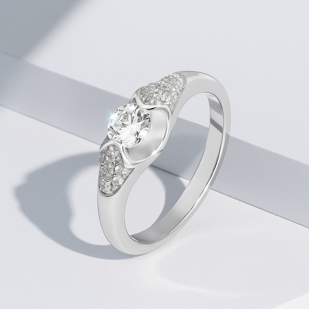 A brilliant diamond rest in harmony, framed by pavé shoulders that flow like waves of light. The sleek, high-polish band keeps the silhouette clean and timeless, drawing every glance to the stone’s fire. Elegant, effortless, and made for forever—this is the classic promise ring, perfected.