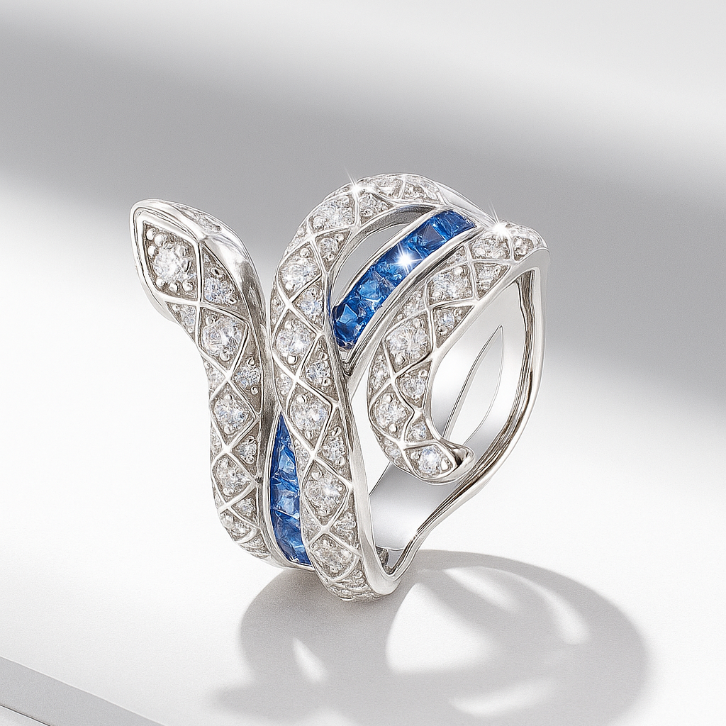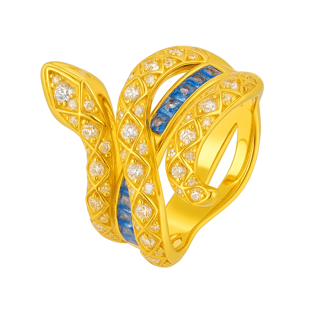 A sculptural masterpiece, this serpent-inspired design coils around the finger in 18k gold, ablaze with VS1 diamonds and a striking line of vivid sapphires. It symbolizes wisdom, transformation, and eternal renewal, delivering an aura of mystery and power to its wearer.