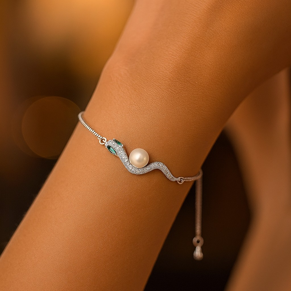 A bracelet where the fluid silhouette of a diamond serpent coils gracefully around a luminous pearl. The emerald eyes of the serpent whisper allure, symbolizing wisdom, mystery, and eternal beauty.