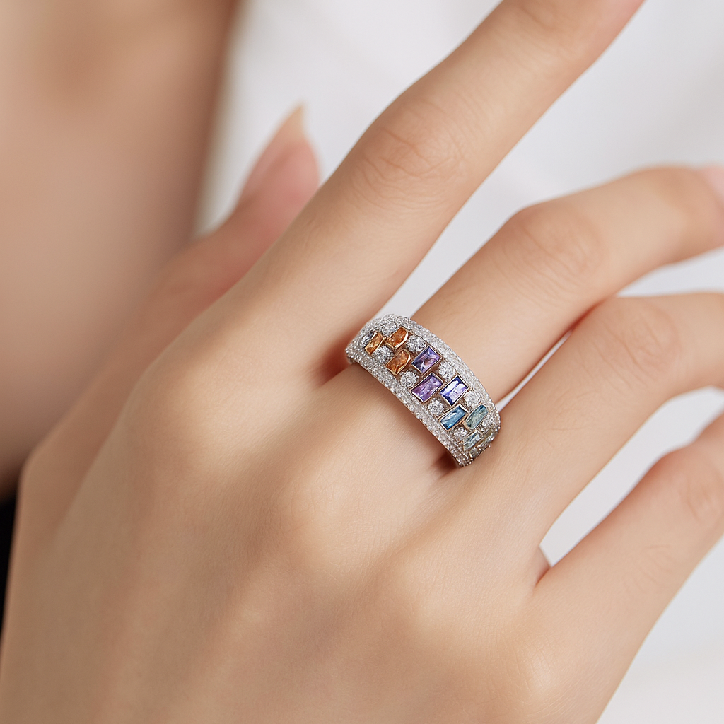 • A symphony of colors captured in the elegance of fine jewelry. This ring features graduated baguette-cut sapphires in a rainbow of hues — from fiery orange to serene violet — each framed by a sparkling sea of VS1 diamonds. Crafted in sleek white gold, it is a statement of individuality and joy, symbolizing life’s most radiant moments, where every shade tells a story of love and light.