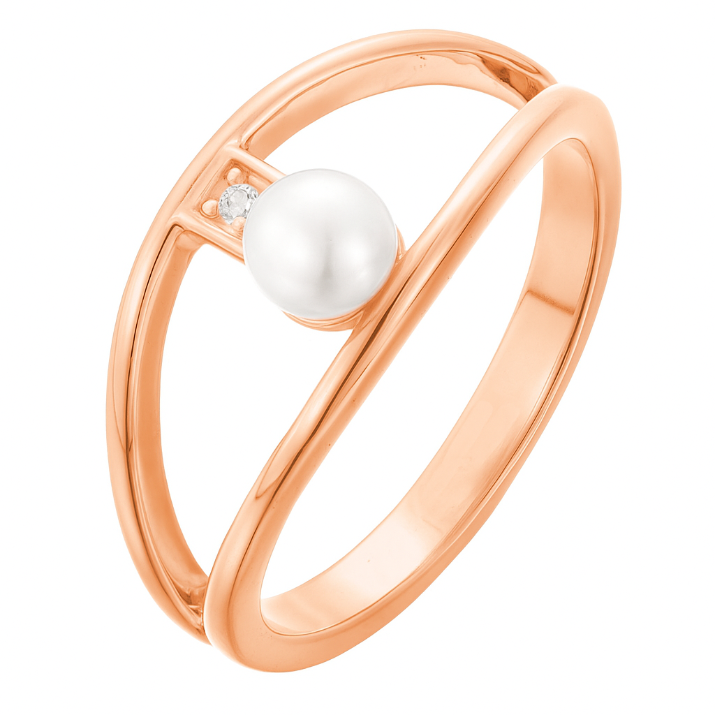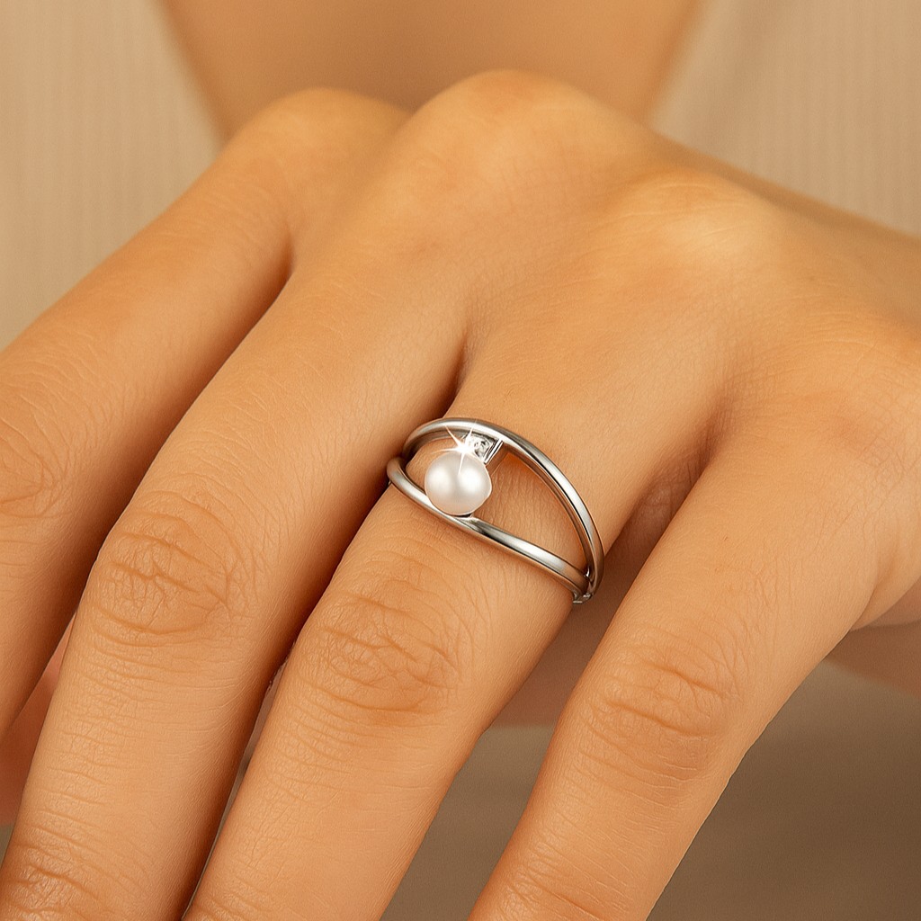 Minimalist yet striking, a pearl suspended within a geometric band evokes balance and serenity. The architectural design offers a modern interpretation of eternal beauty.