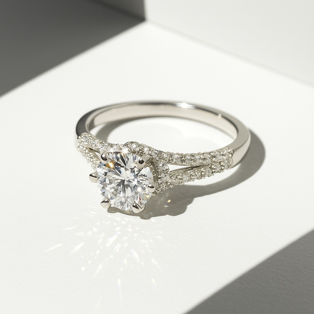A round brilliant centre stone rises above a split pavé band, symbolizing strength and refinement. The design evokes the sparkle of starlight, making it a radiant tribute to life’s shining moments.