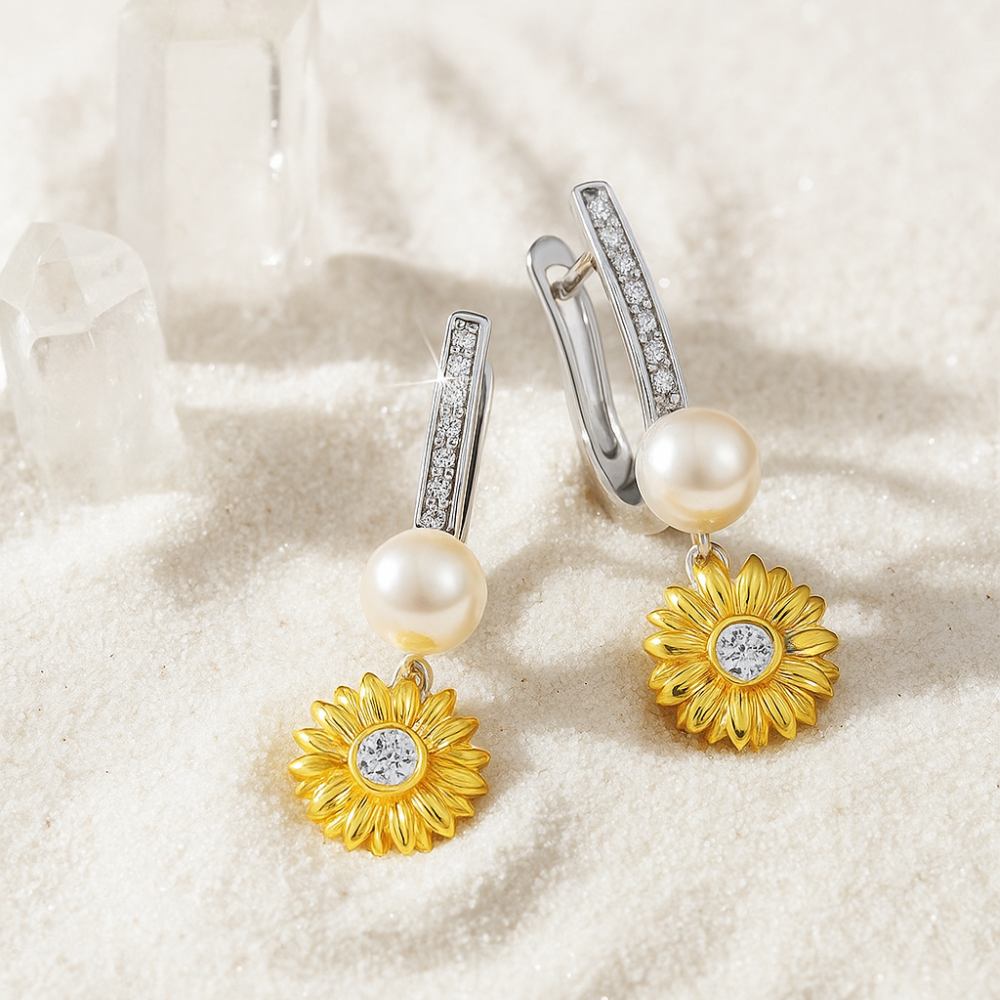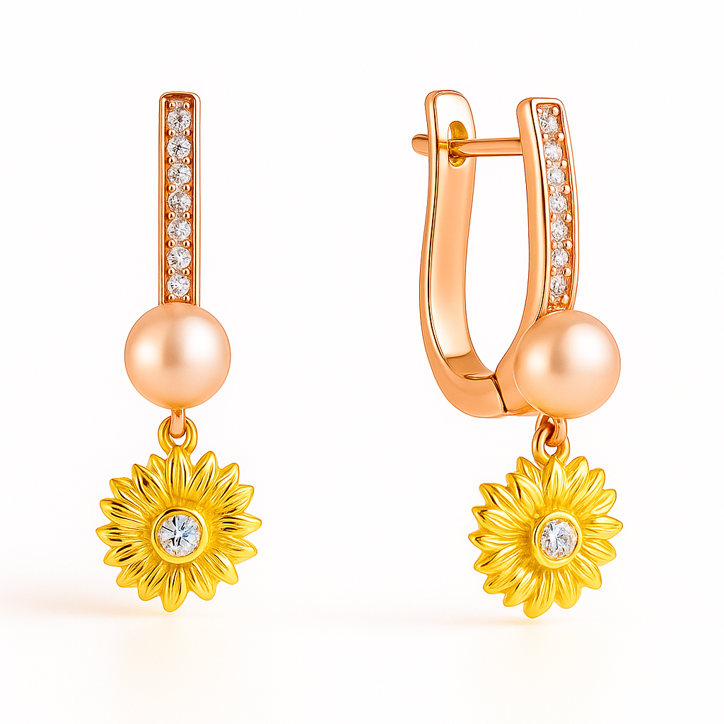 • Where radiance meets grace — a luminous freshwater pearl rests beneath a cascade of pavé-set VS1 diamonds, leading to a golden sunflower in full bloom. At its heart, a single brilliant VS1 diamond captures the purity of morning light, framed by petals kissed in rich gold vermeil. Inspired by the harmony of day and night, these earrings embody timeless elegance, exquisite craftsmanship, and the quiet power of nature’s beauty.