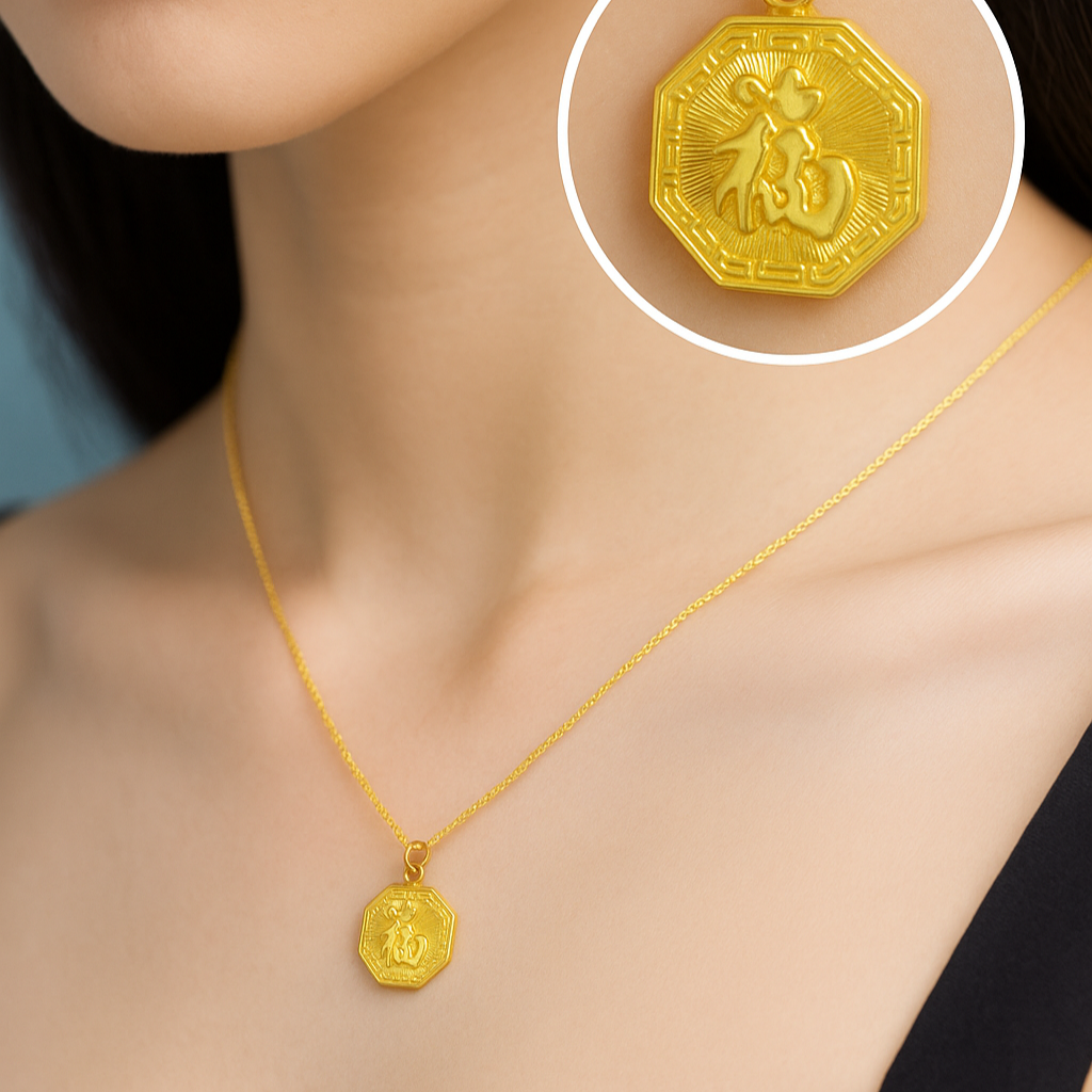 • This exquisite gold pendant, featuring the revered Chinese character 'Fu' (福) for fortune and blessings, is a truly emotional and luxurious piece. Its modern octagonal design and radiant finish make it a captivating statement of prosperity and sophisticated style. Available in three size variations—20mm (25 units), 24mm (21 units), and another 20mm style (21 units)—it’s a powerful talisman to wear and cherish every day