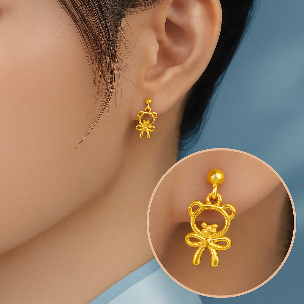 • These exquisite gold earrings feature a charming teddy bear outline, tied with a delicate bow, giving them a whimsical yet sophisticated appeal. The sleek, polished gold finish ensures a modern, high-end look that is both emotionally resonant and stylish. They are the perfect luxury accessory to celebrate innocence, love, or personal nostalgia with undeniable golden radiance.