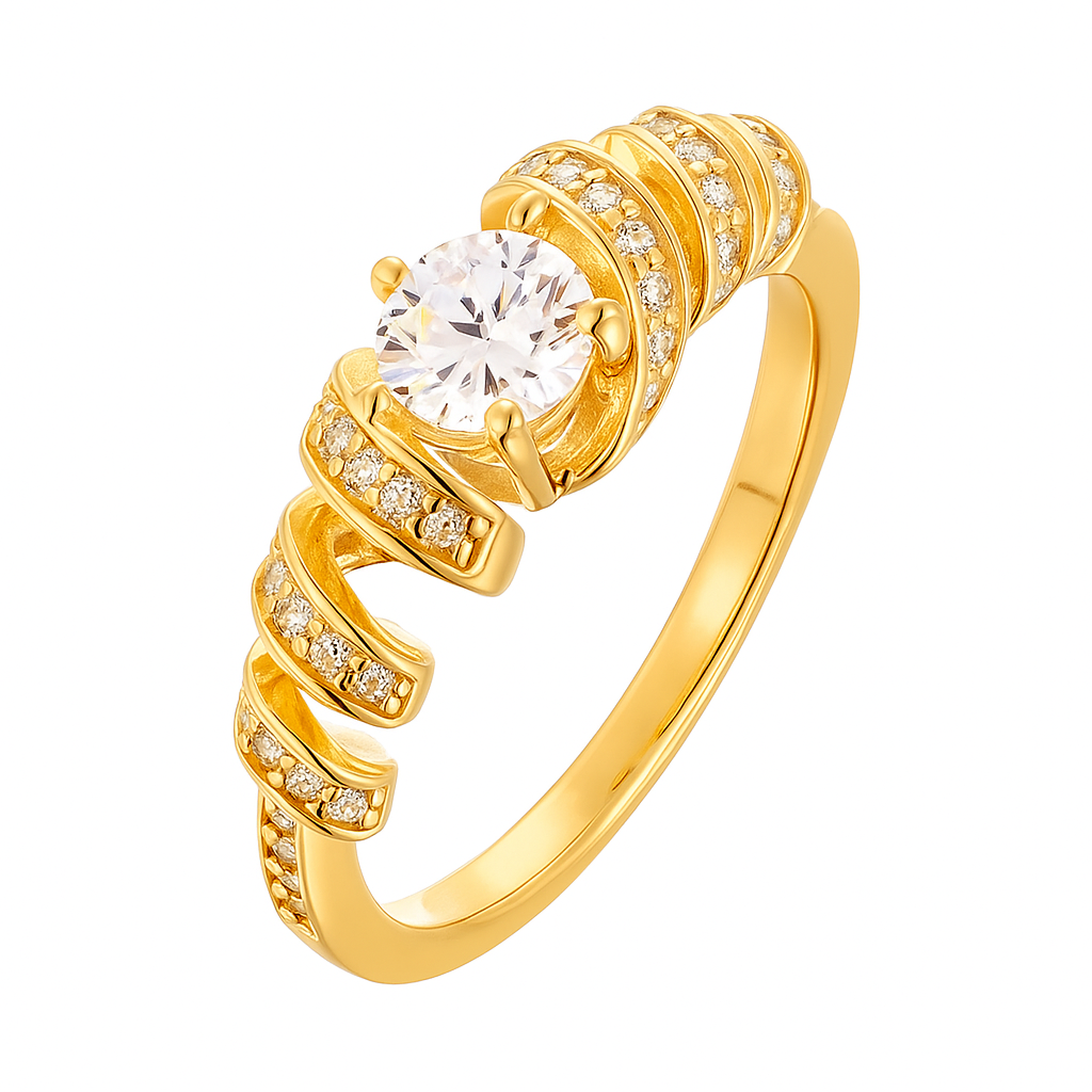 • A dazzling round diamond crests within a band of sculpted waves, each adorned with pavé-set diamonds. The rhythmic design symbolizes resilience, continuity, and the ever-flowing journey of life and love.