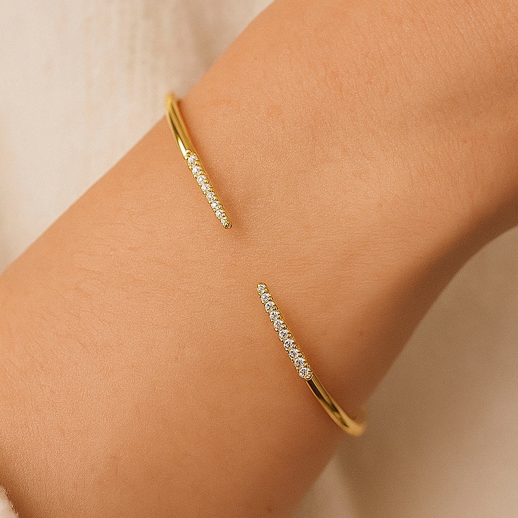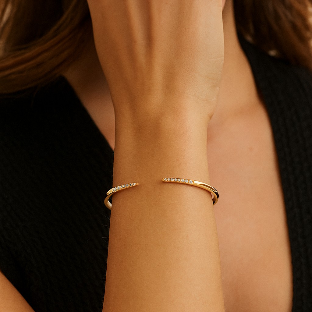 An open-ended bangle that feels like liquid light embracing the wrist. Minimalist yet radiant, each diamond-set tip is a subtle spark of brilliance — perfect for those who embody quiet confidence and timeless sophistication.