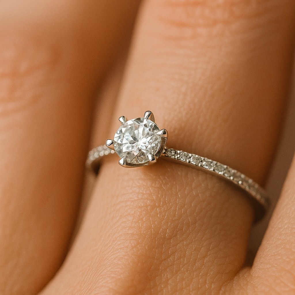 • Slender, ethereal, and infinitely elegant. A fine band adorned with glistening pavé diamonds leads to a brilliant round solitaire, evoking the quiet shimmer of stars across a midnight sky. This design is delicate yet enduring, perfect for the dreamer who values refinement above all.