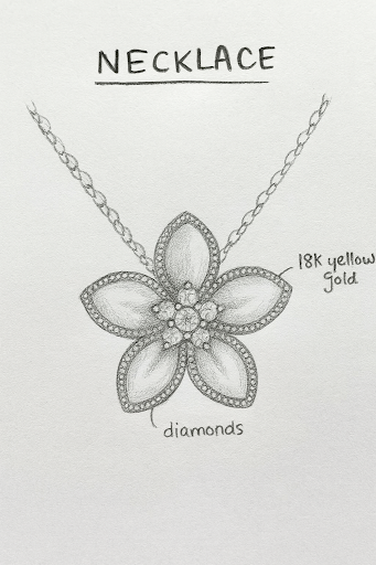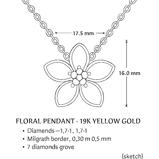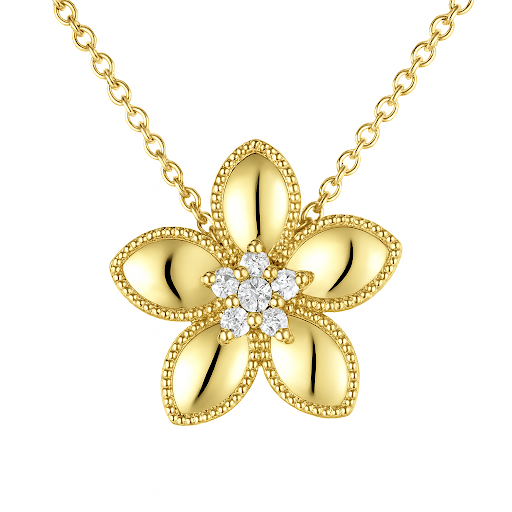 Five-petal floral pendant in 18K Yellow Gold with beaded (milgrain) edging. Each petal is marquise-shaped with soft curvature. Pendant center is a 7-stone diamond cluster.