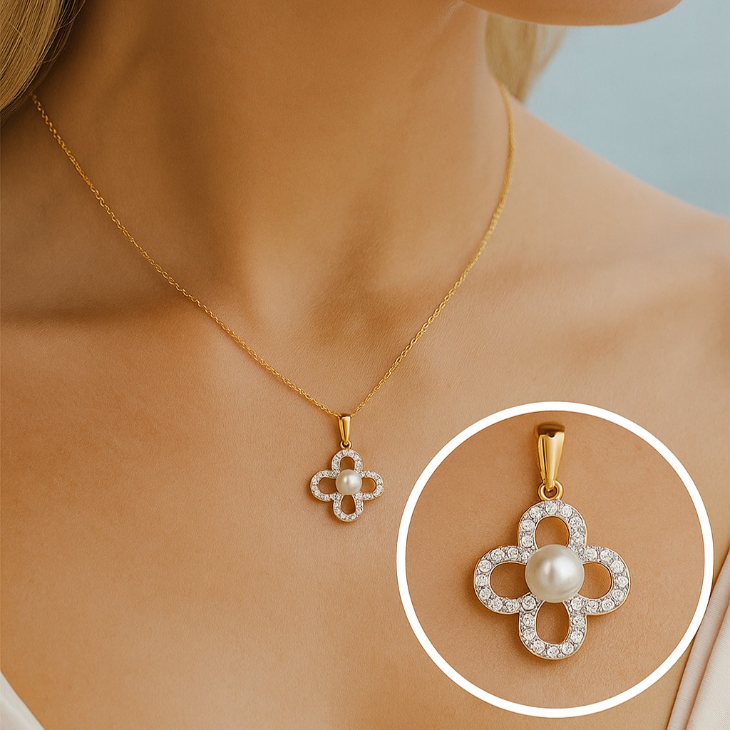• The Étoile de Perle Pendant captures a timeless union of purity and brilliance. At its center, a lustrous pearl radiates with soft, celestial glow, surrounded by a clover-shaped motif delicately traced in VS1 diamonds. Suspended gracefully, the pendant becomes a symbol of serenity and refinement, its design echoing the elegance of starlight framed against a night sky. Whether worn with quiet sophistication during the day or as an evening statement, it whispers of grace and everlasting beauty.