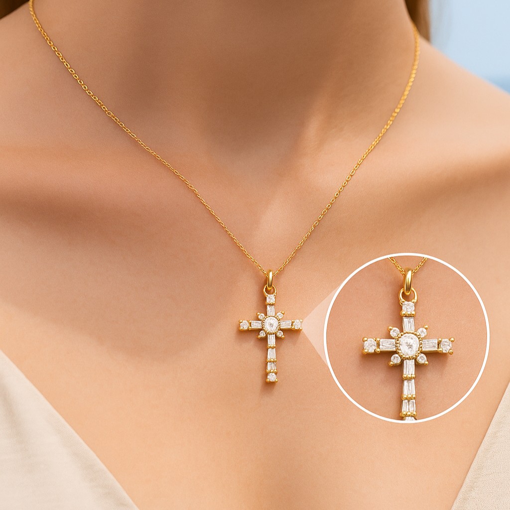 A celestial cross illuminated by baguette and round VS1 diamonds — a luminous emblem of faith, hope, and grace.