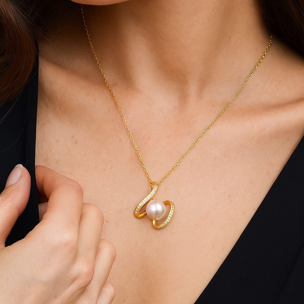 A luminous pearl rests within a swirling ribbon of gold, paved with sparkling VS1 diamonds. The design evokes the ocean’s eternal embrace, a symbol of serenity, grace, and timeless beauty