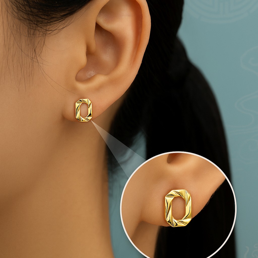• Meticulously crafted in 916 gold, this 10mm x 13mm ear stud showcases a geometric frame design reminiscent of origami artistry. Its clean lines and polished surfaces create a play of light that feels both modern and timeless. Perfect for those who love refined simplicity with a touch of architectural charm. Wear it solo or paired, and let your style unfold in quiet sophistication.