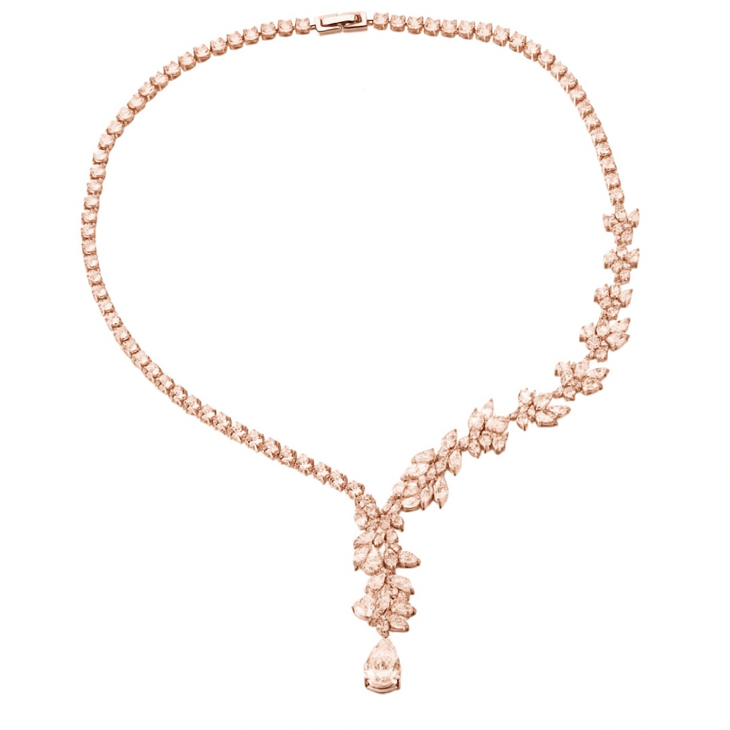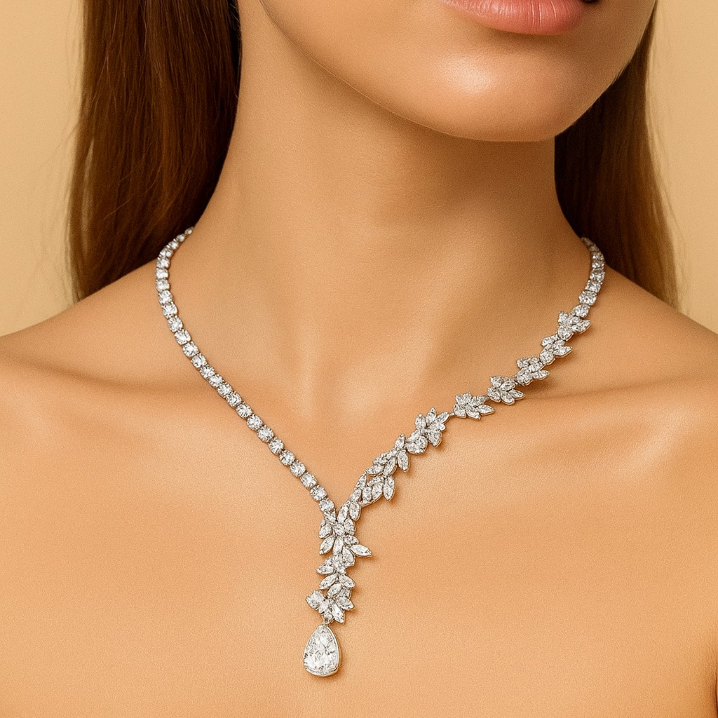 A celebration of elegance in motion, this necklace cascades with asymmetric brilliance, where leaf-like stones trace one side in organic rhythm, converging into a luminous teardrop centerpiece. It embodies the poetry of nature — the balance of wild beauty and refined sophistication. Designed for the woman who walks with quiet strength yet dazzles with presence, this necklace radiates with emotional depth, making it the perfect companion for life’s most cherished occasions.