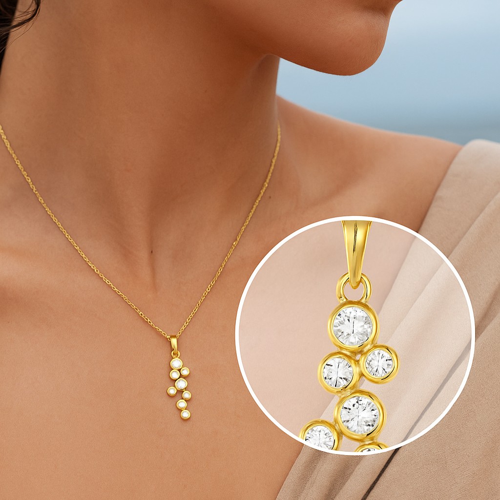A golden pendant of bezel-set diamonds flowing like drops of light, capturing movement and radiance in every step.