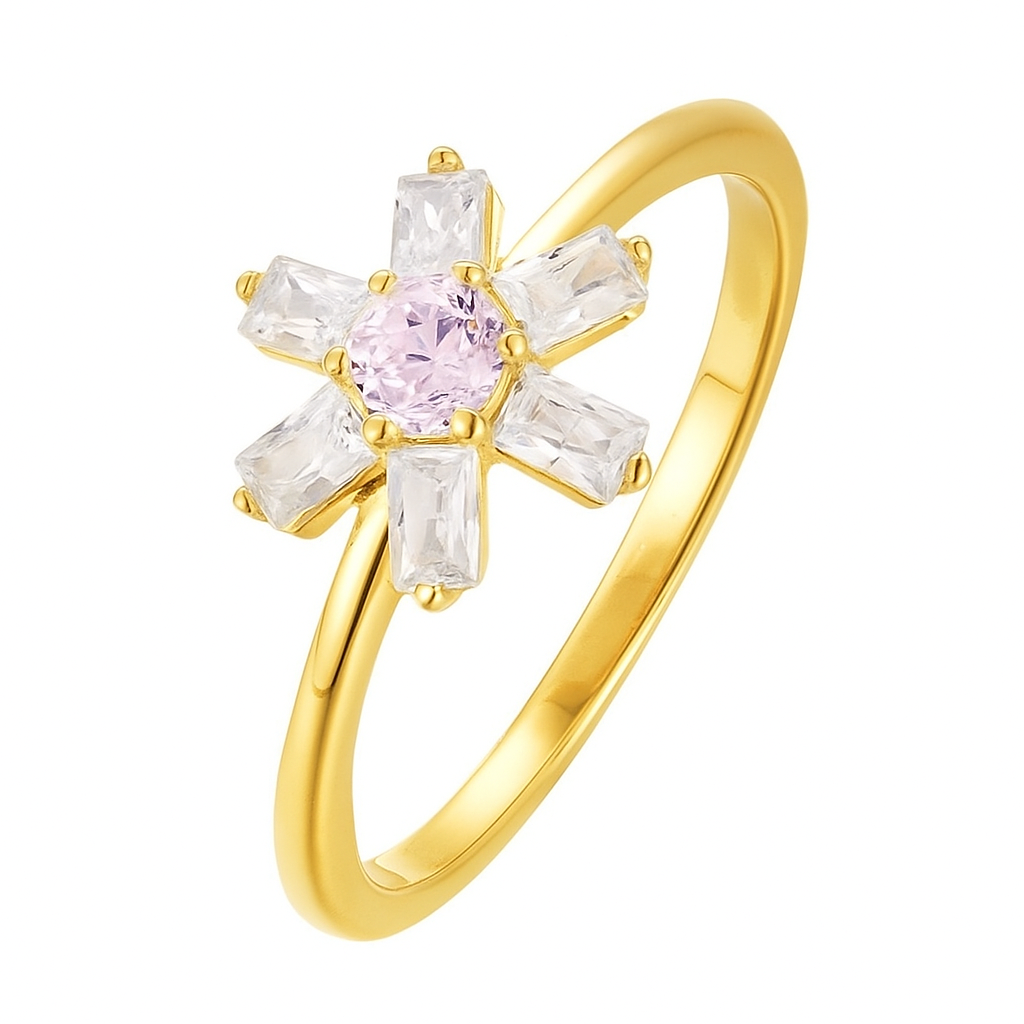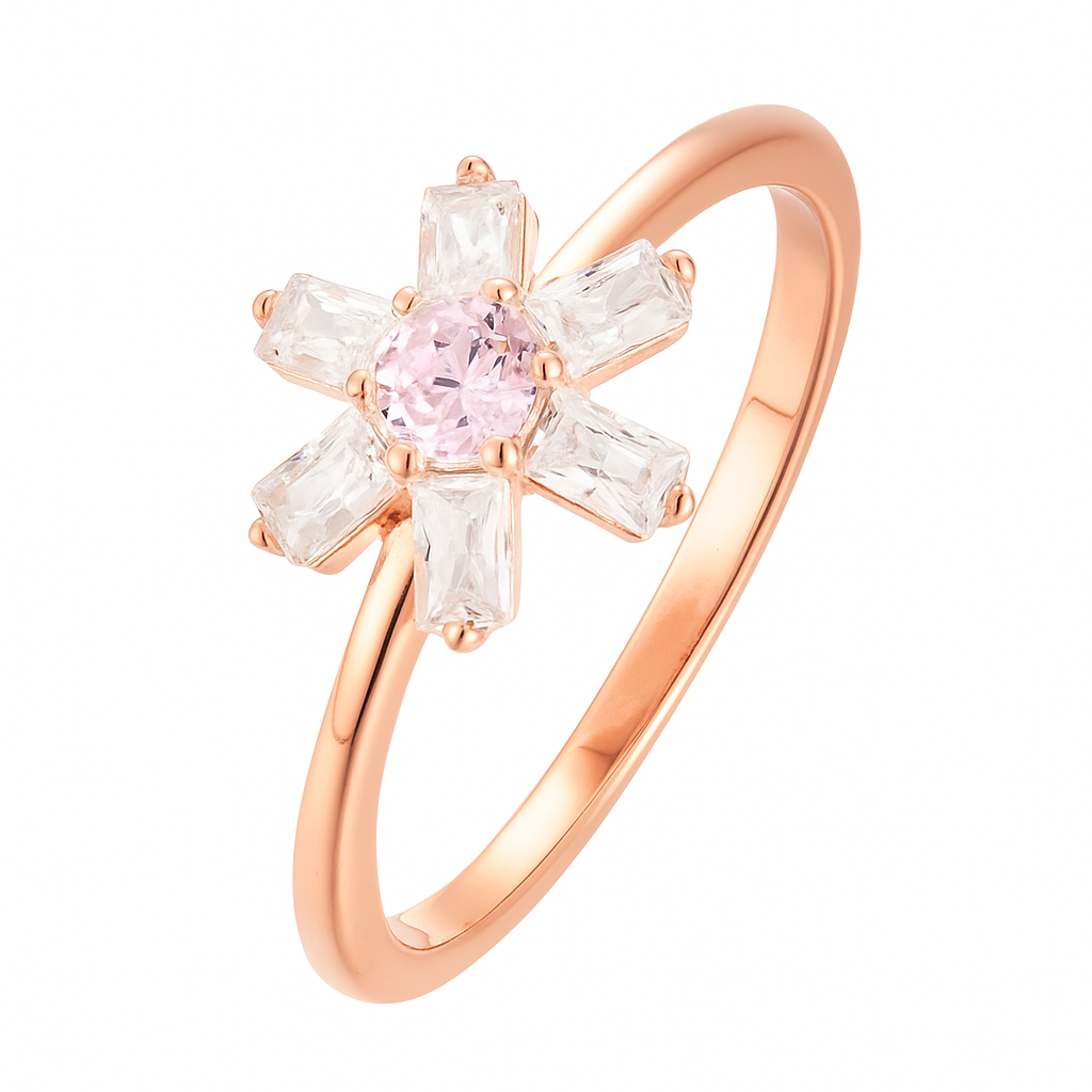 A rare floral-inspired masterpiece: baguette diamonds radiate like petals around a soft pink amethyst , evoking the glow of dawn. Choice of golds; customizable center in pink diamond, sapphire, or white diamond.