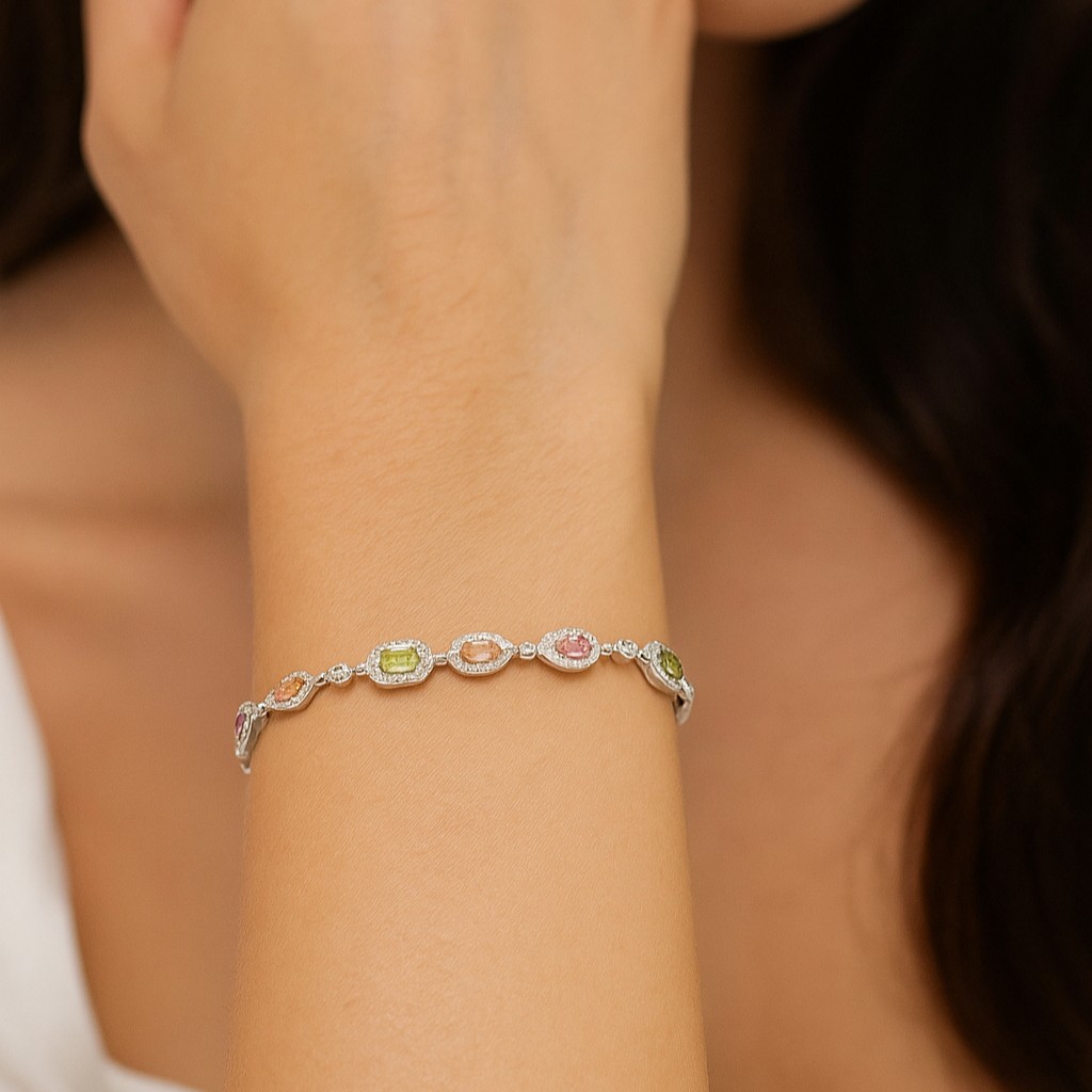A kaleidoscope of pastel gemstones — green tourmaline, blush pink, and golden citrine — elegantly framed with VS1 diamonds, this bracelet captures the colors of dawn in perfect harmony. It’s a radiant celebration of light, designed for the woman who carries her own brilliance everywhere she goes.