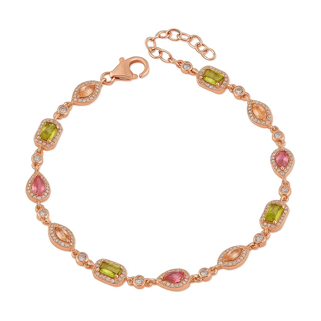 • A kaleidoscope of pastel gemstones — green tourmaline, blush pink, and golden citrine — elegantly framed with VS1 diamonds, this bracelet captures the colors of dawn in perfect harmony. It’s a radiant celebration of light, designed for the woman who carries her own brilliance everywhere she goes.