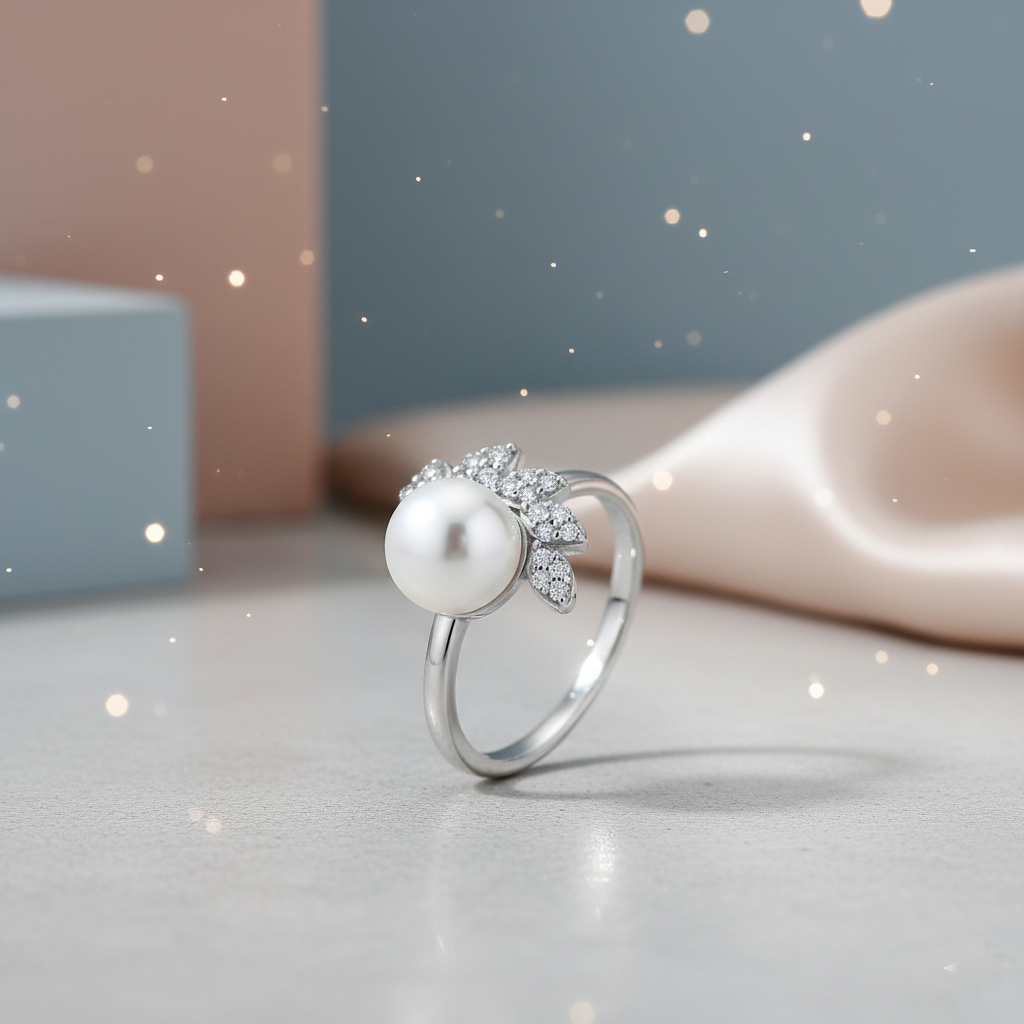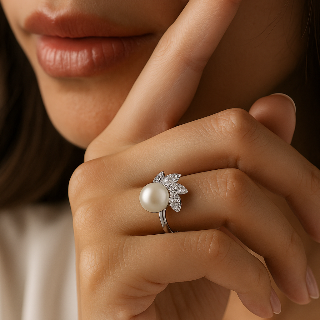 A luminous cultured pearl takes center stage, encircled by diamond-studded petals in micro pavé brilliance. The floral-inspired design balances softness and sparkle, evoking nature’s most elegant forms. This ring is a timeless expression of grace, ideal for those who carry quiet strength and radiant charm