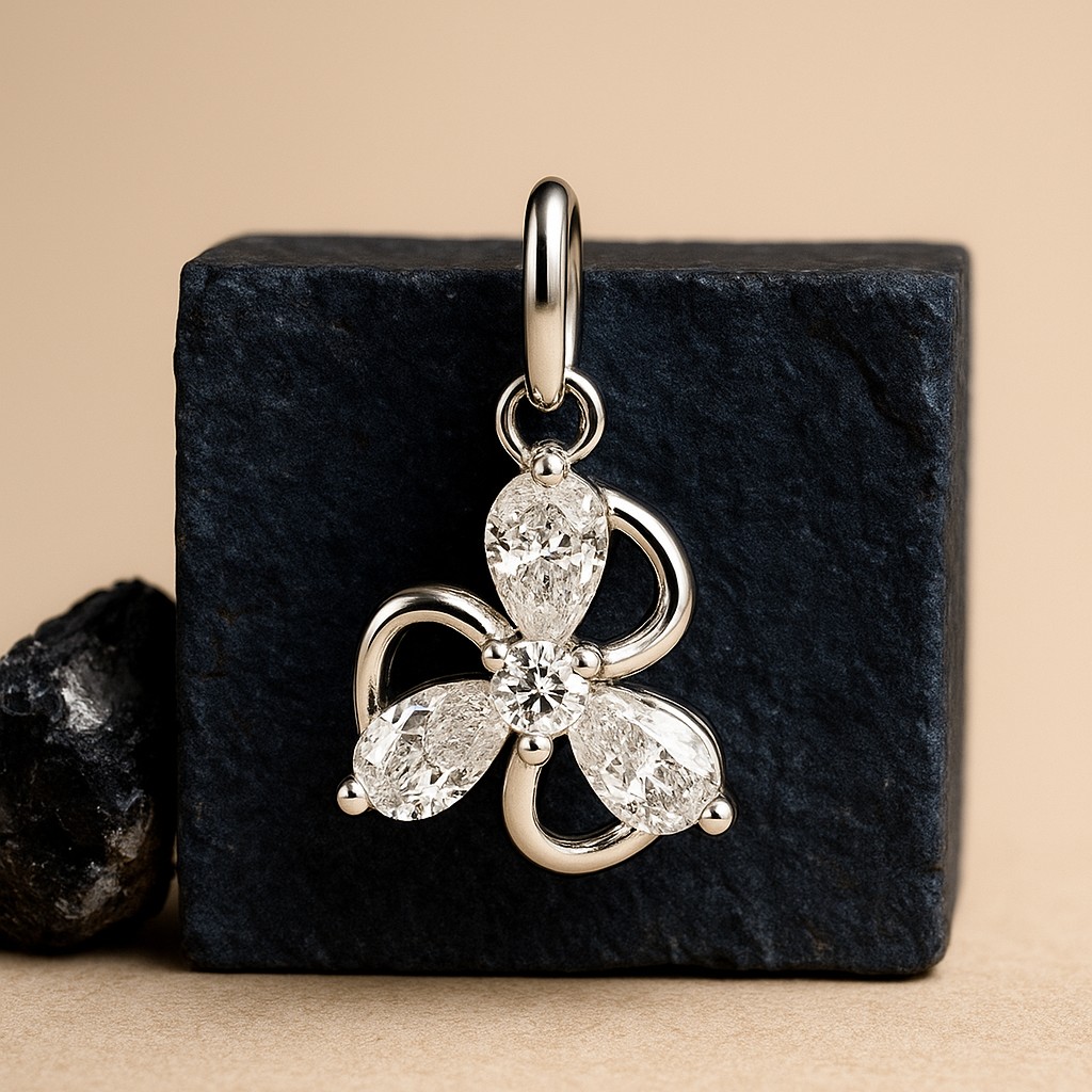 The pendant embodies a soft yet radiant allure, with three marquise-cut diamonds forming the petals of a stylized floral motif. Gracefully interwoven gold lines enhance the sense of movement, while a central diamond sparkles as the heart of the bloom. This pendant rests close to the heart, carrying with it the symbolism of natural grace, growth, and quiet strength.