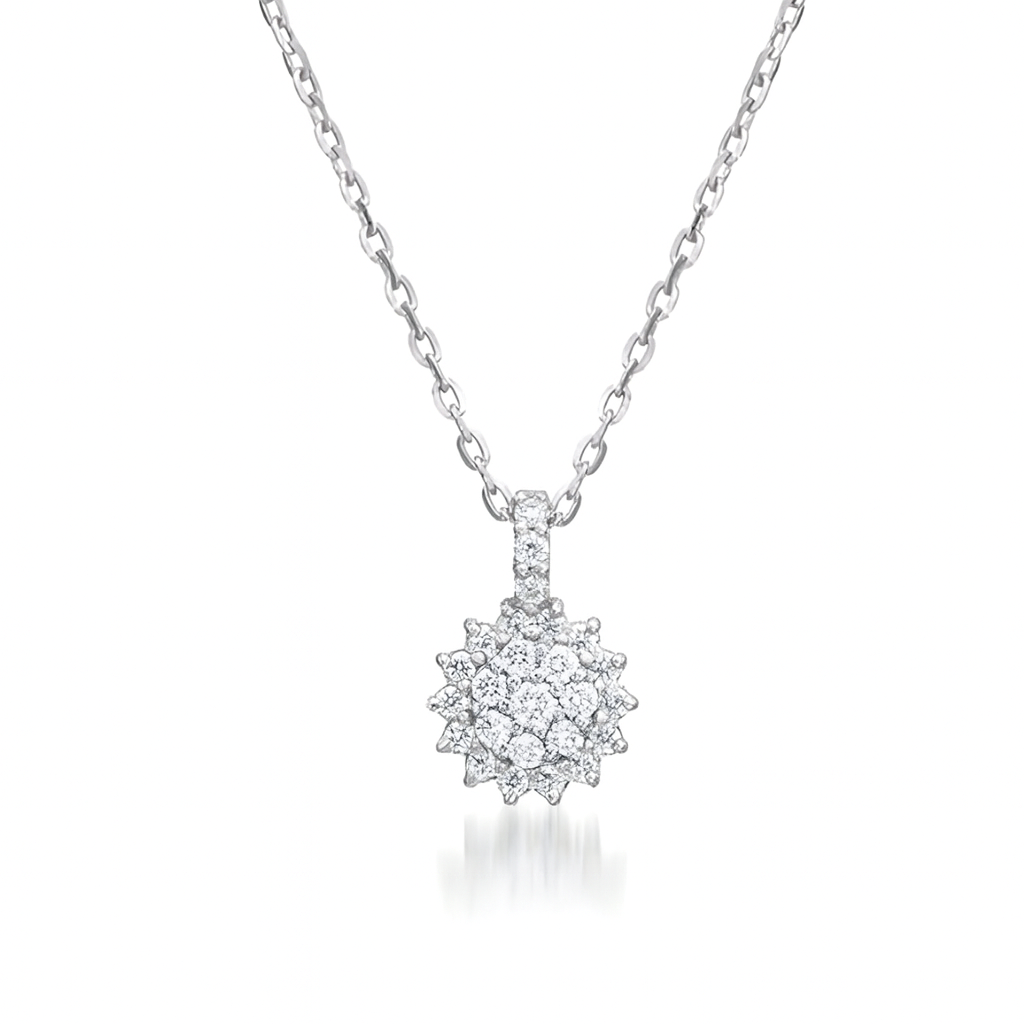 • A starburst of diamonds surrounds a customizable central gem, creating the aura of a sunrise captured in gold. Every angle reveals brilliance—like light breaking over the horizon. A pendant for dreamers, visionaries, and eternal optimists.