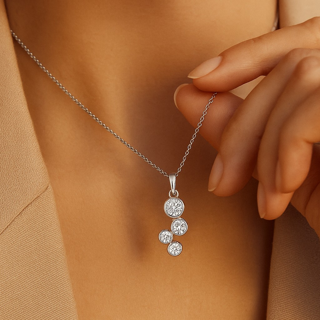 • Suspended with quiet elegance, the Celestia Flow Pendant carries three brilliant VS1 diamonds cascading gracefully downwards. Each stone is bezel-set for a refined, contemporary silhouette, while their descending form evokes the imagery of falling stars or droplets of light. Delicate yet radiant, this pendant captures the beauty of movement frozen in time—a luminous emblem of sophistication.