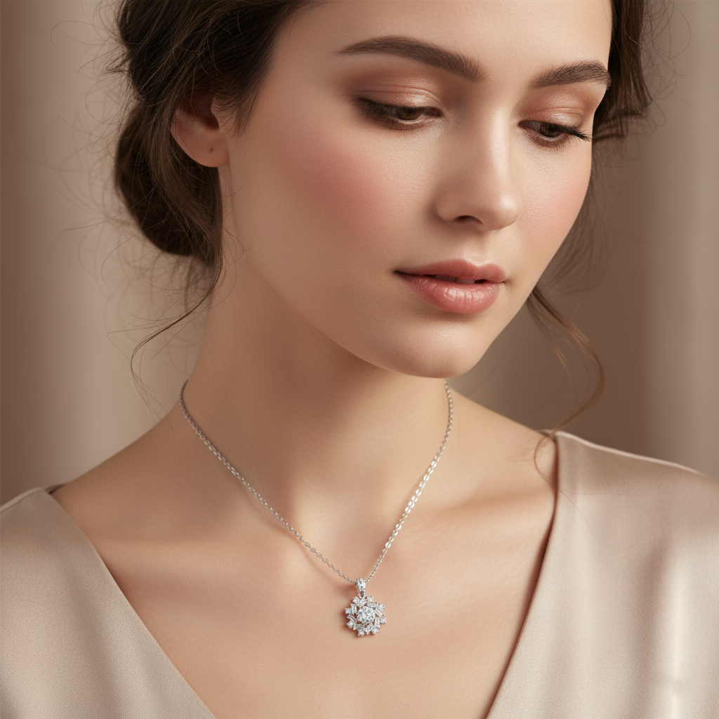 Bursting with brilliance, this star-inspired pendant combines round and baguette-cut diamonds in a symphony of light. A celestial masterpiece, it captures the magic of the night sky, embodying hope, radiance, and divine beauty.