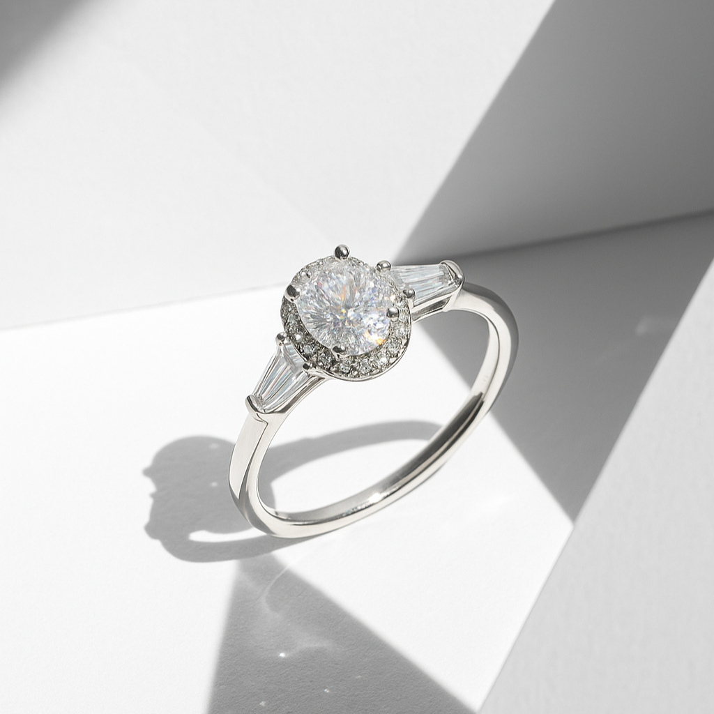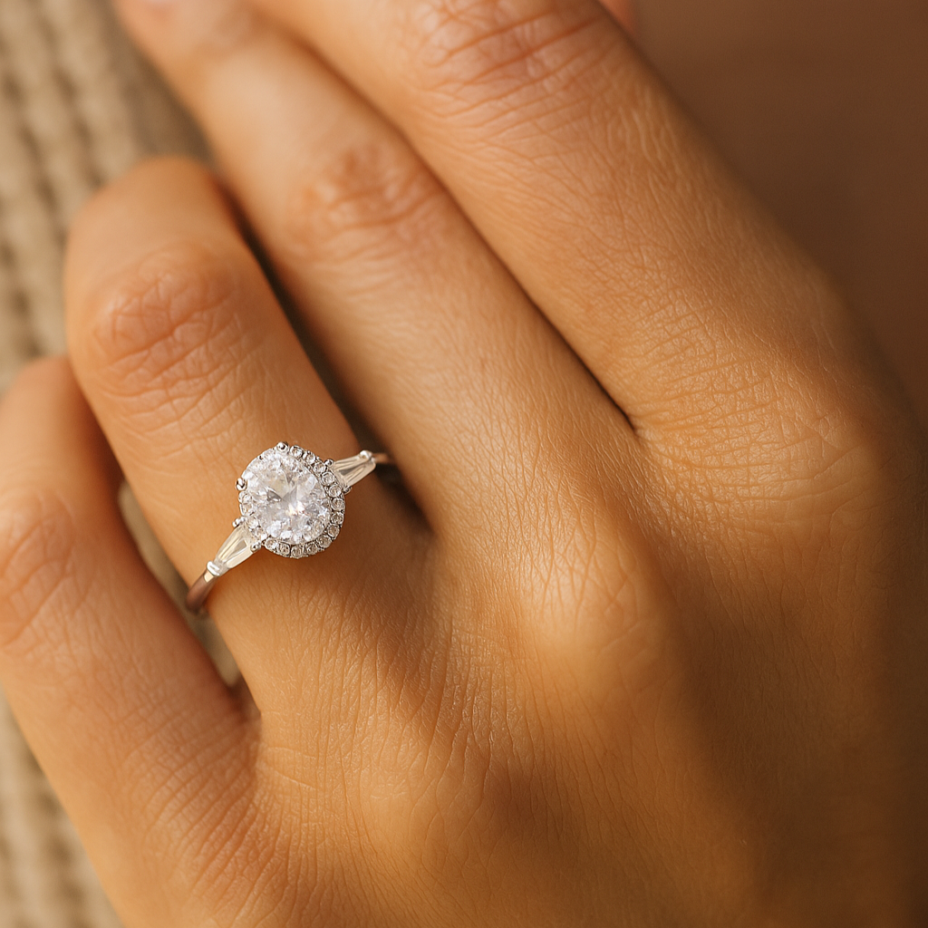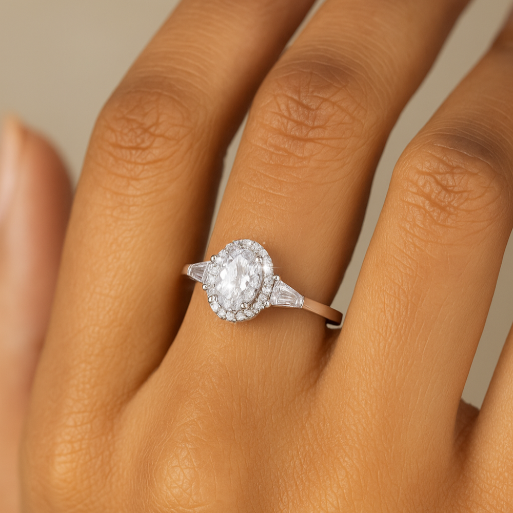 Home “Celestial Crown” Oval Halo with Baguettes Ring