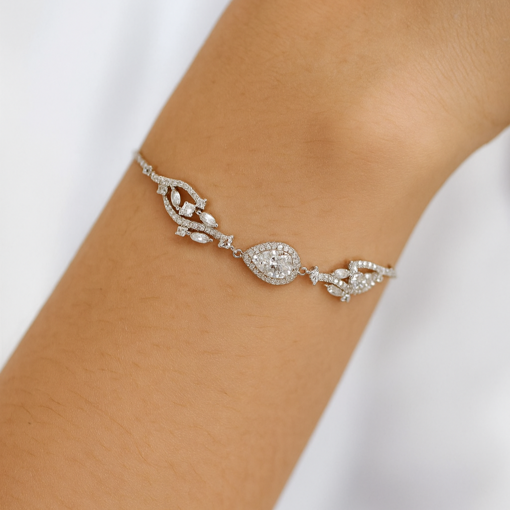 This elegant bracelet captures the harmony of the heavens with alternating marquise and round diamonds, culminating in a pear-shaped centerpiece embraced by a diamond halo. Set in 18k white gold, the design balances fluidity and precision, embodying both movement and eternity. Its delicate presence on the wrist feels like a personal constellation, a secret universe of light carried close to the skin