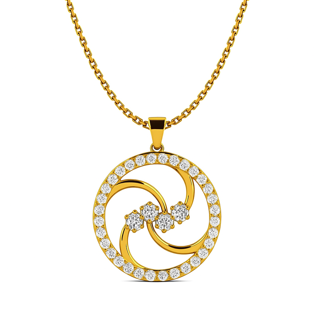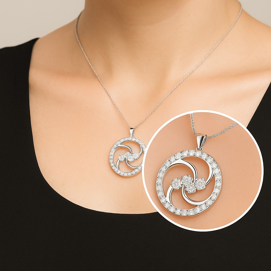 A swirl of brilliance in perfect motion, this pendant celebrates cosmic elegance. The circular design is encrusted with VS1 diamonds, each one placed to radiate like stars caught in perpetual orbit. At its center, sparkling clusters add depth and light, evoking the eternal dance of galaxies. A timeless emblem of infinite beauty.