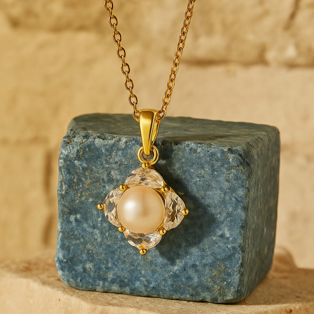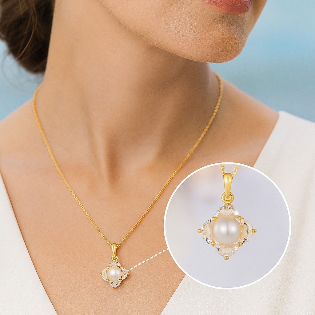 • A luminous pearl radiates from the center of a golden frame, gently cradled by four diamond-accented tips. This pendant exudes timeless grace — a balance of classic refinement and ethereal beauty, making it perfect for both modern and traditional elegance.
